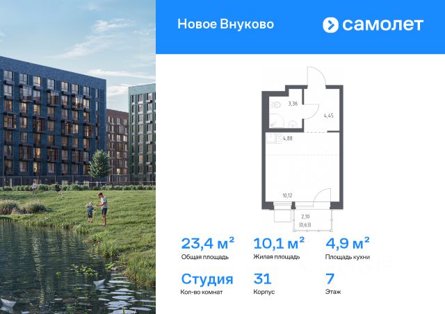 Строим кварталы для жизни с заботой о будущем. Предлагается квартира студия комфорт-класса 28,47 кв.м в корпусе 35 на 7 этаже, в ЖК "Новое Внуково" Квартира без отделки. Доступность опции "отделка" и возможность комплектации мебелью и декором уточняйте у застройщика. Приобрести квартиру возможно по специальным акциям от застройщика, с текущими условиями акций можно ознакомиться в блоке "Акций". Цена динамическая и может отличаться, уточняйте актуальность у застройщика. "Новое Внуково" — это жилой комплекс в Новой Москве, у подножия берега реки Незнайка. Поблизости — живописные места для прогулок: народный парк "Ручеек", усадьба Старо-Никольское, Валуевский и Ульяновский лесопарки. Часть домов сдана и внутри района уже открыт детсад с бассейном, а в ближайшее время откроются еще 3 детсада, 2 школы и поликлиника. На территории проекта будет построен первый в России Центр Российской Федерации Баскетбола, где будут площадки с трибунами, тренажерный зал, кафе и конференц-зал. Дворы-парки закрыты от машин и посторонних. На территории — прогулочный маршрут вдоль реки Незнайка и набережная с шезлонгами и качелями для отдыха. Также здесь появится плейхаб "Незнайка на Луне", площадь для мероприятий с сухим фонтаном, летним кинотеатром и кафе. В жилом комплексе — монолитные дома высотой от 6 до 14 этажей. Фасады облицованы кирпичом природных оттенков.