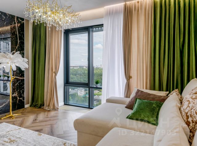 Интерьер квартиры выдержан в мягких светлых тонах с акцентом на натуральные материалы — дерево, шпон, камень. Пространство продумано до мелочей: три полноценные раздельные комнаты, панорамные окна в пол, высокий этаж и максимум естественного света создают ощущение воздуха и свободы.