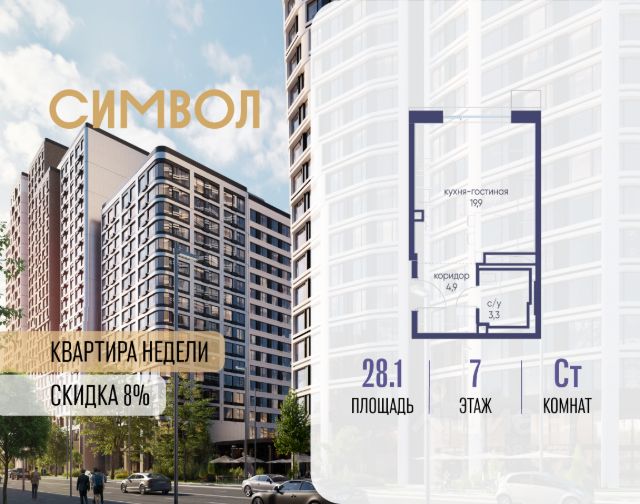 Скидка до 8% действует до 27.02.2026 г. при 100% оплате и не субсидированной ипотеке. Продается квартира-студия от застройщика: общая площадь 28.10 м², жилая 15.00 м², кухня 4.90 м², 7-й этаж, жилой квартал "Гордость", корпус 40 (секция 1). Срок сдачи: 2 квартал 2029 года. Позвоните сейчас и забронируйте квартиру! Квартал бизнес-класса СИМВОЛ - это городское пространство нового поколения в историческом районе Лефортово, на границе ЦАО, в 2 км от Садового кольца. Бионическая архитектура СИМВОЛА превратила Лефортово в суперсовременное и модное пространство. Из окон, с балконов и террас просторных квартир СИМВОЛА открываются отличные виды на город и новый парк "Зеленая река", "протекающий" через все кварталы комплекса на 2 км. В квартале уже есть все, что нужно для комфортной жизни: кафе и рестораны, супермаркеты и магазины, медицинские и физкультурно-оздоровительные центры, салоны красоты и барбершопы, аптеки и оптики, химчистки, пункты доставки и другие сервисы - всего более 90 действующих объектов внутриквартальной инфраструктуры. Для юных жителей СИМВОЛА открыты детский сад и инженерный лицей при МГТУ им. Баумана. Особенности квартала: • Свой парк "Зеленая Река" - 10 га зелени и развлечений на любой вкус! • Уникальная для Москвы архитектура - Проект создан архитектурной мастерской ATRIUM по дизайн-коду британских бюро LDA Design и UHA London. • Богатая инфраструктура с детскими садами и лицеем им. Баумана, кафе и ресторанами, супермаркетами и аптеками, зоной для фитнеса, бассейном и мед. центром. • Квартиры с панорамными окнами, террасами, ванными с окнами и каминами редких форматов. • Закрытые безопасные зелёные дворы-парки без машин!