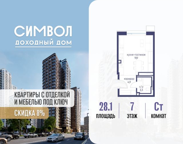 Скидка до 8% действует до 31.03.2026 г. при 100% оплате и не субсидированной ипотеке. Продается квартира-студия от застройщика: общая площадь 28.90 м², жилая 10.00 м², кухня 10.20 м², 7-й этаж, жилой квартал "Гордость", корпус 36 (секция 1). Срок сдачи: 2 квартал 2029 года. Позвоните сейчас и забронируйте квартиру! Квартал бизнес-класса СИМВОЛ - это городское пространство нового поколения в историческом районе Лефортово, на границе ЦАО, в 2 км от Садового кольца. Бионическая архитектура СИМВОЛА превратила Лефортово в суперсовременное и модное пространство. Из окон, с балконов и террас просторных квартир СИМВОЛА открываются отличные виды на город и новый парк "Зеленая река", "протекающий" через все кварталы комплекса на 2 км. В квартале уже есть все, что нужно для комфортной жизни: кафе и рестораны, супермаркеты и магазины, медицинские и физкультурно-оздоровительные центры, салоны красоты и барбершопы, аптеки и оптики, химчистки, пункты доставки и другие сервисы - всего более 90 действующих объектов внутриквартальной инфраструктуры. Для юных жителей СИМВОЛА открыты детский сад и инженерный лицей при МГТУ им. Баумана. Особенности квартала: • Свой парк "Зеленая Река" - 10 га зелени и развлечений на любой вкус! • Уникальная для Москвы архитектура - Проект создан архитектурной мастерской ATRIUM по дизайн-коду британских бюро LDA Design и UHA London. • Богатая инфраструктура с детскими садами и лицеем им. Баумана, кафе и ресторанами, супермаркетами и аптеками, зоной для фитнеса, бассейном и мед. центром. • Квартиры с панорамными окнами, террасами, ванными с окнами и каминами редких форматов. • Закрытые безопасные зелёные дворы-парки без машин!