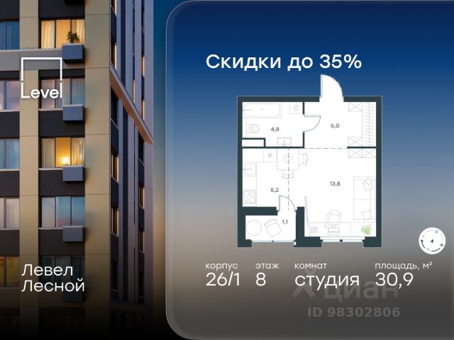 Цена указана с учётом скидки при 100%-й оплате, несубсидированной ипотеке, рассрочке (кроме программы "Рассрочка 0%"). В районе, утопающем в густой зелени лесов, многочисленных парков и скверов, продаётся студия площадью 30.90 кв.м с предчистовой отделкой. Квартира расположена на 8 этаже в жилом комплексе комфорт-класса Левел Лесной (компания Level Group/Левел групп). Отличная транспортная доступность: - 25 мин. пешком до станции метро "Пятницкое шоссе"; - 28 мин. на автобусе до станции метро и МЦД-2 "Волоколамская"; - 11 мин. на авто до МКАД; - 25 мин. на авто до ТТК. Продуманный архитектурный проект: - Концепция проекта Левел Лесной от бюро СПИЧ; - Высотность комплекса до 15 этажей с уникальными видами на лесные массивы и город; - Высота потолков до 3 м; - Современные окна высотой до 1,6 м, в части квартир предусмотрены окна в пол. Высота подоконников 0,6 м; Расположение: Жилой комплекс Левел Лесной строится в зелёной зоне ближайшего Подмосковья, г.о. Красногорск в посёлке Отрадное. Шаговая и автомобильная доступность до метро и больших транспортных артерий города. За 25 минут вы дойдёте до станции метро "Пятницкое шоссе", а за 20 минут на машине сможете доехать до станции метро "Тушинская". Район окружен роскошной зеленью лесов и парковых зон, занимающих территорию свыше 1 000 гектаров. Помимо благоприятной экологии, здесь множество возможностей для активного отдыха и поддержания физической формы. Облагороженная территории с полностью развитой инфраструктурой. На территории проекта находится детский сад и школа "Светлые Горы", которая входит в список лучших частных школ от Forbes Education (по данным на 2023г.). Кроме того, в пешей доступности расположено ещё 8 детских садов, а также запланировано открытие современной муниципальной школы. В непосредственной близости находятся сетевые супермаркеты и локальные магазины, аптеки, клиники, почта, библиотека, салоны красоты, рестораны, спортивные и творческие секции, развивающие детские центры. В 12 минутах пешком расположен торговый парк "Отрада" с продуктовым и строительным гипермаркетами, магазинами, кинотеатром и развлечениями для детей. Внутренняя инфраструктура: Мы знаем, как важно, чтобы магазины и сервисы были всегда рядом. В сданных корпусах жилого комплекса Левел Лесной уже расположена полностью готовая развитая инфраструктура. На первых этажах корпуса 27 предусмотрено ещё 14 коммерческих помещений. Благоустройство: Продуманное пространство и аура приватного европейского городка рождают чувство лёгкости и расслабления у каждого, кто попадает на территорию проекта. Концепцию общественных площадок разработали в партнёрстве два архитектурных бюро: "Хайлайт Архитектура" (Highlight Architecture) и "Скейп" (Scape). В безопасных дворах без машин каждый обязательно найдёт себе место для вдохновения, отдыха и спорта.