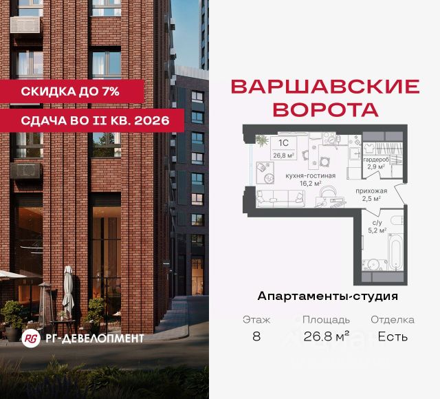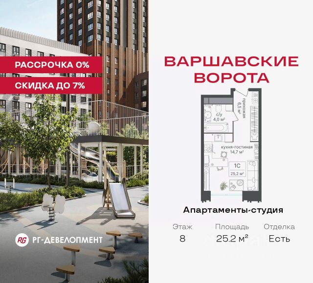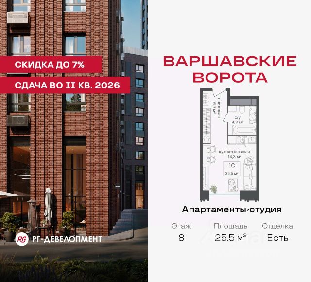 Рассрочка 0% + скидка 5%. Первый взнос 20%, второй — через 6 мес., остаток —до ввода. Продаются Апартаменты-студия 25.5 кв.м. в МФК "Варшавские ворота" на 8-м этаже 30 этажного дома. МФК "Варшавские ворота" — это точка баланса между природой и городом, стилем и функциональностью, жизнью сегодня и устойчивым будущим. Коротко о важном: - 1 минута пешком от м. Аннино; - Удобные выезды на Варшавское шоссе и МКАД; - Высота потолков 2,7 - 3 м; - Закрытый двор-парк; - Школы и детские сады в 10-15 минутах пешком от дома; - Технические лоджии для размещения кондиционеров; - Подземный паркинг; - РГ-Девелопмент — ТОП-20 крупнейших застройщиков Москвы. Проект сочетает в себе современную архитектуру и продуманное благоустройство с уникальным природным окружением. Всего в нескольких минутах от дома — девять парков, каскад прудов и крупнейшие лесопарковые зоны Москвы, создающие ощущение жизни в зеленом оазисе посреди мегаполиса. Архитектурная концепция - стиль Чикаго в Москве. Фасады облицованы вентфасадами под клинкерную плитку. Фасады подчеркивают строгие линии и современный стиль, а входные группы разработаны московским бюро Синтаксис. Вестибюли оформлены с применением керамогранита, декоративной штукатурки и гипсовых панелей, детали из латуни добавляют изысканности. Проект находится в 1 минуте пешком от метро "Аннино", в 12 минутах от станции "Улица Академика Янгеля" и рядом с МЦД-2 "Красный Строитель". Для автомобилистов предусмотрен прямой выезд на Варшавское шоссе и два съезда на МКАД, что позволяет быстро добираться в любую часть города. Среди планировочных решений представлены разнообразные форматы: от функциональных студий до просторных 4-комнатных квартир и апартаментов. Высокие потолки усиливают ощущение простора, а продуманные планировки включают мастер-спальни, гардеробные, объединённые кухни-гостиные и несколько санузлов. Центральное пространство комплекса — закрытый двор без машин. Он разделён на функциональные зоны: детские игровые комплексы, спортивные площадки и уютные места для тихого отдыха. На первых этажах разместятся магазины, кафе и сервисы, что позволит решать повседневные задачи, не покидая территорию комплекса. Для семей с детьми предусмотрен частный детский сад на 50 мест. Подземная парковка и кладовые обеспечат удобство хранения и безопасность автомобилей. Комплекс окружён девятью парками и лесопарками, каждый из которых обладает своей атмосферой. Выйти на пробежку в Аннинском лесопарке, насладиться прогулками по аллеям в Битцевском лесу, спланировать пикник или велопрогулку в Покровском парке, любоваться каскадом Кировоградских прудов. Всего в двух станциях — музей-заповедник "Царицыно" с дворцами, фонтанами и живописными пейзажами. Здесь каждый житель найдёт своё любимое место для отдыха. Южное Чертаново - район развитой инфраструктурой, где сочетаются городские удобства и природное окружение. В шаговой доступности находятся школы, детские сады, спортивные комплексы и торговые центры. Э