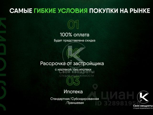 Предлагаем вашему вниманию уютную Студия-комнатную квартиру общей площадью 37,2 кв.м на 9 этаже в новой очереди строительства ЖК "Одинбург". Этот обновленный проект от компании AFI Development включает в себя актуальные архитектурные решения и функциональные планировки. Для всех действует предложение от застройщика Назови свою скидку, подробности акции уточняйте у менеджеров отдела продаж. Новый Одинбург - это: • Возможность выбора между квартирами без отделки и с базовой отделкой (White Box). • Высокие потолки 2.8 м (в чистоте). • Просторные кухни-гостиные до 27 кв.м. • Балкон или лоджия в каждой квартире с панорамным остеклением. • Нишы для хранения вещей в прихожей и отдельные гардеробные. • Несколько санузлов для больших семей. • Живописный вид из окон на лес и городские пейзажи. И даже больше, чем комфорт-класс: • Монолитные дома с вентилируемым фасадом и облицовкой из декоративного камня. • Дизайнерская отделка мест общего пользования с мебелью и архитектурная подсветка фасадов. • На первых этажах предусмотрено помещение консьержа 24/7 и колясочная. • Развитая инфраструктура: в шаговой доступности расположено 6 детских садов, школы и лицей, магазины, кафе, салоны красоты и спортивные объекты. • Огороженная территория: двор без машин для безопасного отдыха и прогулок с детьми разных возрастов. • Машиноместа в отапливаемом подземном паркинге с доступом из лифта, в многоуровневом наземном паркинге и гостевые парковочные места. • Транспортная доступность: 7 минут до МЦД Одинцово, 10 минут до МКАД, 17 минут до центра Москвы по трассе М-1. Пространство для жизни: • Безопасность: наличие системы видеонаблюдения обеспечивает спокойствие и защиту вашего жилья. • Природа рядом: комплекс граничит с Подушкинским и Дубковским лесами, что позволяет наслаждаться свежим воздухом. • Большое количество спортивных объектов: ледовый дворец, волейбольный центр, центр горнолыжного спорта и школы Олимпийского резерва РФ и целый спортивный парк имени Героя России Ларисы Лазутиной. • Коммьюнити соседей со схожим образом жизни. Не упустите шанс стать владельцем квартиры в одном из самых перспективных жилых комплексов Подмосковья на выгодных условиях! Звоните прямо сейчас, чтобы узнать подробности и записаться на просмотр.