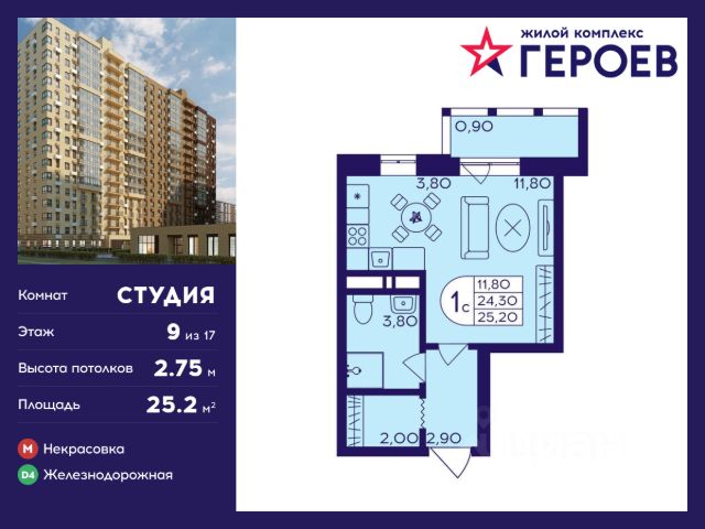 Продаётся студия 28.70 кв. м. в жилом комплексе "Героев" в Балашихе, Железнодорожный. Квартира расположена на 9 этаже 410 корпуса. В наличии квартиры с отделкой. Всего 40 минут до центра Москвы. При покупке квартиры в сданном доме ключи выдаются сразу! Жилой квартал "Героев" - это уютный проект для семей с детьми. В квартале созданы все условия для досуга всех возрастов: игровые и спортивные площадки, места для отдыха и прогулочные зоны. За 15 минут можно дойти от дома до Ольгинского лесопарка, популярного места для отдыха на свежем воздухе. На территории жилого комплекса уже открыт детский сад на 250 мест и началось строительство еще одного - для 220 малышей, а также школы для 1320 учеников. Рядом работают магазины, кафе, супермаркеты, пункты выдачи. Преимущества: • В уютных светлых квартирах с просторными кухнями-гостиными удобно встречать гостей и проводить время наедине друг с другом. • Благодаря увеличенному остеклению в комнатах много света. • Квартиры продаются с отделкой, можно заселяться сразу после получения ключей.
