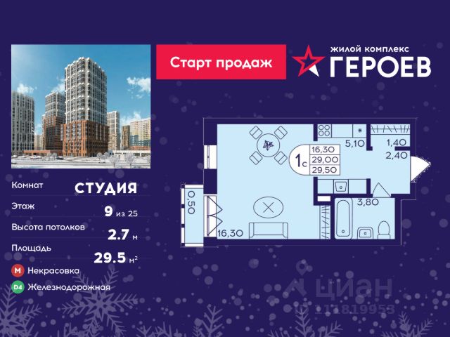 Продаётся студия 29.50 кв. м. в жилом комплексе "Героев" в Балашихе, Железнодорожный. Квартира расположена на 9 этаже 610 корпуса. В наличии квартиры с отделкой. Всего 40 минут до центра Москвы. При покупке квартиры в сданном доме ключи выдаются сразу! Жилой квартал "Героев" - это уютный проект для семей с детьми. В квартале созданы все условия для досуга всех возрастов: игровые и спортивные площадки, места для отдыха и прогулочные зоны. За 15 минут можно дойти от дома до Ольгинского лесопарка, популярного места для отдыха на свежем воздухе. На территории жилого комплекса уже открыт детский сад на 250 мест и началось строительство еще одного - для 220 малышей, а также школы для 1320 учеников. Рядом работают магазины, кафе, супермаркеты, пункты выдачи. Преимущества: • В уютных светлых квартирах с просторными кухнями-гостиными удобно встречать гостей и проводить время наедине друг с другом. • Благодаря увеличенному остеклению в комнатах много света. • Квартиры продаются с отделкой, можно заселяться сразу после получения ключей.