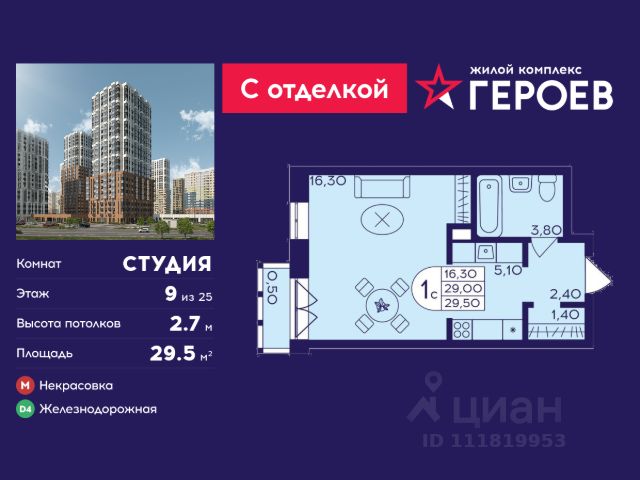 Продаётся студия 25.6 кв. м. в жилом комплексе "Героев" в Балашихе, Железнодорожный. Квартира расположена на 9 этаже 411 корпуса. Все квартиры представлены с чистовой отделкой. Вам не нужно тратить время и дополнительные финансы на ремонт или жить в шуме строительных работ - достаточно перевести свои вещи, расставить мебель и всё готово! Жилой квартал "Героев" - это уютный проект для семей с детьми. Всего 40 минут до центра Москвы. В квартале созданы все условия для досуга всех возрастов: игровые и спортивные площадки, места для отдыха и прогулок, магазины, кафе и пункты выдачи. За 15 минут можно дойти от дома до Ольгинского лесопарка - популярного места для прогулок и отдыха на свежем воздухе. Здесь приятно гулять всей семьёй, заниматься спортом или устроить пикник в выходной день. Преимущества: Квартира с готовой отделкой. Пространство полностью подготовлено для жизни: не нужно тратить время и деньги на ремонт или ждать его окончания. После получения ключей достаточно расставить мебель - и можно сразу заезжать и жить. Продуманные и светлые планировки. Просторные кухни-гостиные создают комфортное пространство для отдыха и встреч с близкими. В квартирах предусмотрены удобные гардеробные, благодаря чему легко поддерживать порядок и не перегружать комнаты шкафами. Увеличенное остекление. Большие окна наполняют квартиру естественным светом в течение всего дня, создавая ощущение простора и уюта, а также визуально расширяя пространство и делая интерьер более воздушным. Пешая доступность до станции Железнодорожная (МЦД-4) - дорога займёт не более 30 минут до центра Москвы: станции метро "Курская", "Площадь Ильича" или ТПУ Нижегородская.