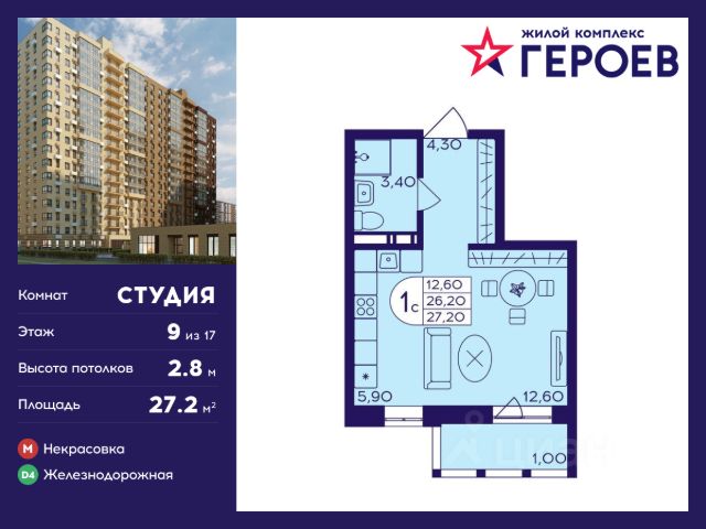 Продаётся студия в сданном доме (Безымянная, 16 (Север, корпус 23)), срок сдачи: IV-кв. 2023, общей площадью 19.7 кв.м., на 9 этаже. Расположение, транспортная доступность