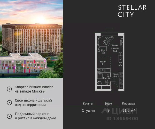 Продается квартира от надежного застройщика Tashir Estate в квартале бизнес-класса Stellar City в ЗАО Москвы. Площадь квартиры составляет: 28.7 кв. м, потолки: 3.1 м Квартира находится на 9 этаже, 4 корпуса жилого квартала Stellar City — микрогорода будущего на орбите Москвы. Stellar City — квартал в ЗАО Москвы вблизи инновационного центра Сколково. В окружении — 11 парков и природных зон, в том числе Долина реки Сетунь, Мещерский лес и парк развлечений The Rink. Город в городе Чтобы дом и инфраструктура вокруг отвечала динамичному лайфстайлу жителя мегаполиса, в основу проекта легла концепция город в городе, которая позволяет решать все бытовые вопросы in-home. В квартале будут возведены школа и детский сад, воркаут-зоны, променад, вело и беговые дорожки, детские площадки для каждого корпуса, а также коммерция на первых этажах для ежедневных покупок. Все необходимое — на расстоянии нескольких шагов. Изящные и лаконичные лобби Авторский дизайн, натуральные материалы в отделке и безупречный интерьер вне времени. Лобби и холлы в проекте бизнес-класса Stellar City ничем не отличаются от входных групп в премиум-сегменте благодаря качественным европейским материалам в отделке, стильному дизайну, консьерж-сервису и уютной зоне ожидания с журнальными столиками и мягкой мебелью. Комфорт и безопасность Закрытая территория, охрана, система СКУД, специально разработанное мобильное приложение дома для резидентов и подземный паркинг с круглосуточным наблюдением и доступом с помощью автоматического считывания номера авто.