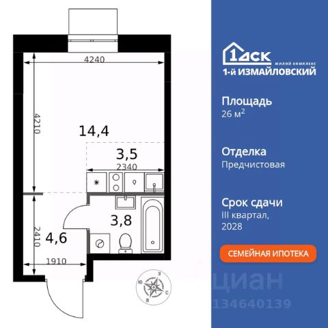 • ИПОТЕКА 10% ДЛЯ ВСЕХ БЕЗ НАЦЕНОК • ДОСТУПНО ПО СЕМЕЙНОЙ ИПОТЕКЕ Прямая продажа от застройщика! Жилой Комплекс Комфорт класса. Продаётся квартира-студия номер 537 общей площадью 26.3 кв.м. на 9-м этаже 32 этажного здания. Отделка Whitebox. Особенности квартиры: - Линейная планировка - максимальная функциональность и удобство. - Гибкая планировка - создайте пространство по своему вкусу. - Место для игры/занятия спортом - идеальное пространство для активных детей. - Можно оборудовать рабочее место - комфорт для работы и учёбы. - Линейная кухня - функциональность и практичность в одном решении. - Ниша под шкаф - компактное и удобное место для вещей. Квартира с предчистовой отделкой (White box). Вам не придется заниматься черновыми и трудоёмкими работы, а чистовую отделку и дизайн - сделайте на свой вкус. Информация о комплексе: Современный архитектурный проект "1-й Измайловский" - идеальное место для проживания, расположенное в восточной части Москвы в окружении 14 000 гектаров леса. Комплекс пронизан атмосферой здорового образа жизни и благополучия. Сиреневый сад и близлежащие лесопарки - это места, где можно насладиться лыжными прогулками зимой и тонизирующими пробежками летом. Расположенный между Щелковским шоссе и Амурской улицей, "1-й Измайловский" осмысляет себя не столько через близость к городским точкам притяжения, сколько через соседство с зелеными пространствами и спортивными объектами. Он отгорожен от шоссе застройкой первой линии и собственными садами здоровья. В его окнах - изумрудное море парка "Лосиный остров" и густые кроны окрестных дворов. В его графике - занятия спортом и прогулки в Измайлове. Транспортная доступность: Не более 2,5 км до станций метро "Щёлковская" и "Черкизовская" и МЦК "Локомотив". Щёлковское шоссе соединяет квартал с Северо-восточной хордой и МКАД, Центральным автовокзалом и Восточным железнодорожным вокзалом. Две автобусные остановки в паре минут ходьбы и 11 маршрутов общественного транспорта. На автомобиле 3 минуты до СВХ 12 минут до ТТК 15 минут до Садового кольца Внутренняя инфраструктура: Комплекс находится в исторически сложившемся районе Москвы с хорошим качеством и плотностью инфраструктуры. Торговые центры и сетевые магазины -6 детских садов, включая собственный детский сад на 125 мест -3 школы, включая собственную школу -Поликлиники и медицинские центры -Парки и зоны отдыха Расположение архитектурного проекта создает все условия для тех, кто стремится к здоровому образу жизни и для тех, кто уже сделал выбор в его пользу. В ближайшем окружении расположены несколько стадионов и множество спортивных объектов для занятий спортом на любой вкус: от всеми любимого футбола, баскетбола и до конного спорта. В окружении проекта более 30 километров организованных беговых и велодорожек.