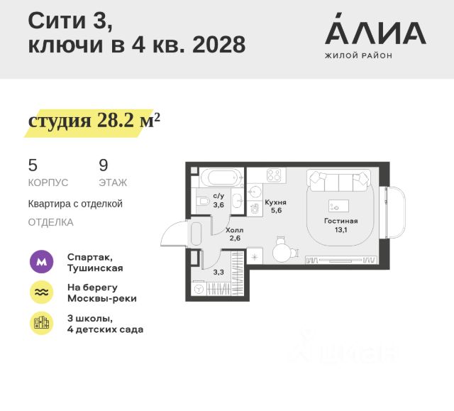 Продаётся Студия 20.9 м². В жилом районе Алиа на 9-м этаже 12-этажного дома. Жилой район Алиа — это дома бизнес-класса у слияния Москвы-реки и Сходни. Алиа находится в Покровском-Стрешневе, экологически чистом районе на престижном северо-западе столицы. Район возводится на бывшей территории Тушинского аэрополя, где никогда не было промышленного производства. Алиа — это район разностороннего развития, спроектированный по принципу WORK.LIVE.PLAY.LEARN. Это "15-минутный город", где вся необходимая для комфортной жизни инфраструктура — на расстоянии приятной прогулки. У района удобное расположение: отсюда меньше 10 минут пешком до станций метро "Спартак" и "Тушинская" и всего полчаса на автомобиле до центра города или аэропорта Шереметьево. Архитектурную концепцию Алиа разработало бюро SOM (Skidmore, Owings & Merrill), авторы знаменитой "Бурдж-Халифа". В Алиа больше 140 планировочных решений, среди которых — редкие для Москвы форматы: квартиры с окном в ванной, пентхаус, сити-юниты и таунхаусы. Почти половина территории района отдана под благоустройство. В Алиа три парка: Линейный парк с кафе и магазинами, Центральный парк с амфитеатром, сухим фонтаном и большим плейхабом для детей всех возрастов и Прибрежный парк на собственной набережной, одной из самых длинных в Москве. В каждом урбан-блоке — закрытый внутренний двор с гипоаллергенными растениями и детской площадкой. В лобби каждого жилого корпуса в Алиа оборудована зона ожидания, колясочная, гостевой санузел и лапомойка для домашних животных. За стойкой ресепшена резидентов и их гостей встречает консьерж. Центральное лобби урбан-блока — это стильное общественное пространство с коворкингом, лаундж-зоной и кофе-пойнтом. Это "вторая гостиная" жителей урбан-блока и одно из мест, где формируется комьюнити Алиа. Два ключевых объекта инфраструктуры в Алиа — это спорткомплекс "Чкалов Арена", где представлены 25 видов спорта, и самый большой в стране бизнес-парк класса A, благодаря которому району обеспечено быстрое развитие.