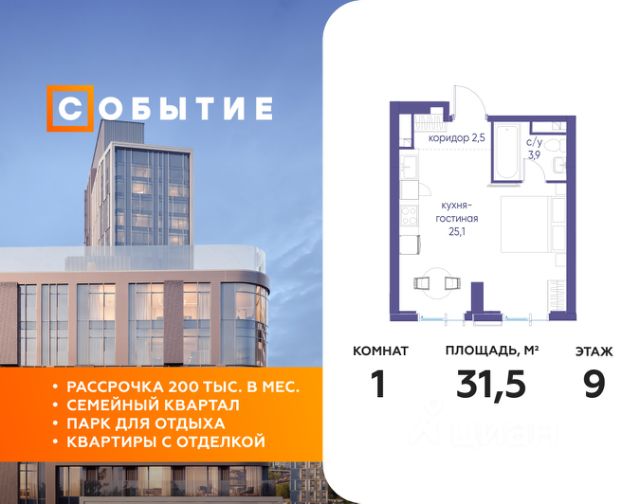 В продаже студия от застройщика. Общая площадь 33.00, жилая 16.50, кухня 8.5. Квартира расположена на 9 этаже жилого квартала "Событие-6", корпус 1, Секция 3. Квартира с чистовой отделкой. Срок сдачи: 4 кв. 2029 года. СОБЫТИЕ.6 — финальный дом парк-квартала СОБЫТИЕ на Мосфильмовской. Переезжайте в уже сформированный квартал с готовой инфраструктурой и парком! Премиальный жилой комплекс в престижном районе Москвы предлагает стильную архитектуру, продуманное благоустройство и великолепно разнообразие общественных пространств. Свой парк прямо возле дома! Архитектура Архитектура СОБЫТИЯ.6 выполнена в ультрасовременном стиле московским бюро Atrium на основе дизайн-кода британских архитекторов LDA Design и UHA London. Дом отличает оригинальная геометрия фасадов, большое остекление и высокие лобби (до 6,2 м) с авторской мебелью и светильниками. Расположение Мосфильмовская улица (Раменки) — один из престижных районов Москвы. Близость к историческому и деловому центру, природным зонам Запада столицы. Транспортная доступность: • 10 мин до Москва-Сити и ТТК; • 15 мин до Садового кольца; • 25 мин до аэропорта Внуково; • 7-10 мин до станций метро "Аминьевская" и "Мичуринский проспект". Инфраструктура: • парк "Событие" (12 га, финалист конкурса Правительства Москвы) с беговыми (1,5 км) и велодорожками (2,7 км), экотропой (1,6 км), площадками, лекторием; • школа, детский сад, магазины, салоны красоты, рестораны (к моменту заселения); • мультидвор с игровыми и спортивными площадками, мини-бульваром; • общественная терраса на 10-м этаже (коворкинг, лаунж); • Закрытые общественные пространства: детская комната, спортивный зал, коворкинг, лаунж-зоны. Паркинг 256 мест для жителей (48 — для электромобилей), 24 гостевых (5 — для электромобилей), мойки колес, кладовые, зоны для велосипедов. Окружение Парки и заповедники (Воробьёвы горы, Матвеевский лес и др.), МГУ, театр им. Н. И. Сац, стадион "Лужники". Безопасность Видеонаблюдение, контроль доступа, видеодомофоны, консьерж-сервис 24/7, системы пожарной безопасности и мультисервисная оптическая сеть.