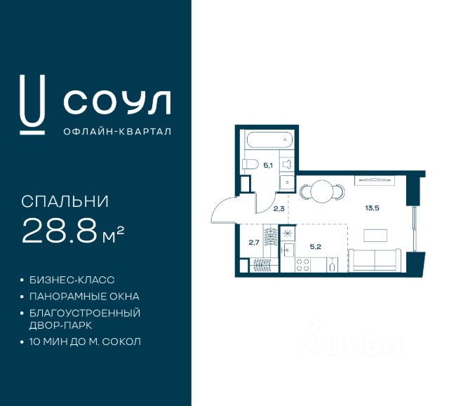Цены указаны с условием 100% оплаты и стандартной ипотеки. Прямая продажа от застройщика! Продается студия номер 382 общей площадью 28.8 кв.м. на 5-м этаже 18 этажного дома, Корпус 8. Без отделки. Проект бизнес-класса СОУЛ от девелопера FORMA. До метро Сокол 10 мин пешком. Архитектура от британского бюро SimpsonHaugh. Благоустройство дворов — Gillespies и GAFA. Территория состоит из культурного парка и приватных дворов. Озеленение в эстетике лесного оазиса. Насыщенное благоустройство: прогулочные тропинки, релакс-зоны, пряный и сенсорный сады, развивающие детские площадки и воркауты. В центре проекта объект культурного наследия — общественное пространство Изофабрика, построенная в 30-х годах по проекту архитектора Георгия Гольца. Здесь будут располагаться мастерские для взрослых и детей, выставочные залы, коворкинги, образовательный центр, рестораны и кафе. Квартиры с панорамными окнами, мастер-спальнями, гардеробными, классическими балконами и лоджиями, видовыми террасами. Высота потолков от 2,9 до 3,5 м. В проекте 2 детских сада на 100 и 200 малышей. Клубная гостиная, фитнес-комната, детская игровая комната, дизайнерские лобби, подземный паркинг и кладовые.
