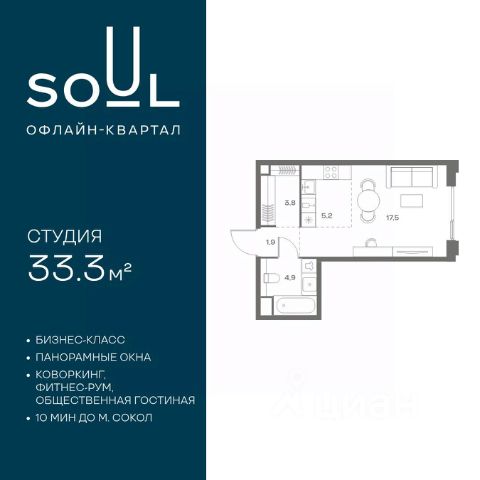 Цены указаны с условием 100% оплаты и стандартной ипотеки. Прямая продажа от застройщика! Продается студия квартира номер 666 общей площадью 33.3 кв.м. на 9-м этаже 24 этажного дома, Корпус 9. С отделкой White Box Max. Проект бизнес-класса SOUL от девелопера FORMA. До метро Сокол 10 мин пешком. Архитектура от британского бюро SimpsonHaugh. Благоустройство дворов — Gillespies. Центральная площадь с фонтанами и местами для отдыха. Оборудованные детские и спортивные площадки. В центре проекта объект культурного наследия — общественное пространство Изофабрика, построенная в 30-х годах по проекту архитектора Георгия Гольца. Здесь будут располагаться мастерские для взрослых и детей, образовательный центр, рестораны и кафе. Квартиры с панорамными окнами, французскими балконами, мастер-спальнями и гардеробными. Высота потолков от 3,1 м. На последнем этаже 3,5 м. В проекте 2 детских сада на 100 и 200 малышей. Фит-рум, коворкинг, дизайнерские лобби, подземный паркинг и келлеры. Продам квартиру-студию в ипотеку рядом с метро Аэропорт.