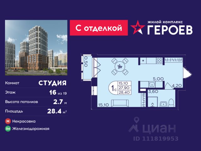 Продаётся студия 30.2 кв. м. в жилом комплексе "Героев" в Балашихе, Железнодорожный. Квартира расположена на 5 этаже 408 корпуса. Все квартиры представлены с чистовой отделкой. Вам не нужно тратить время и дополнительные финансы на ремонт или жить в шуме строительных работ - достаточно перевести свои вещи, расставить мебель и всё готово! Жилой квартал "Героев" - это уютный проект для семей с детьми. Всего 40 минут до центра Москвы. В квартале созданы все условия для досуга всех возрастов: игровые и спортивные площадки, места для отдыха и прогулок, магазины, кафе и пункты выдачи. За 15 минут можно дойти от дома до Ольгинского лесопарка - популярного места для прогулок и отдыха на свежем воздухе. Здесь приятно гулять всей семьёй, заниматься спортом или устроить пикник в выходной день. Преимущества: Квартира с готовой отделкой. Пространство полностью подготовлено для жизни: не нужно тратить время и деньги на ремонт или ждать его окончания. После получения ключей достаточно расставить мебель - и можно сразу заезжать и жить. Продуманные и светлые планировки. Просторные кухни-гостиные создают комфортное пространство для отдыха и встреч с близкими. В квартирах предусмотрены удобные гардеробные, благодаря чему легко поддерживать порядок и не перегружать комнаты шкафами. Увеличенное остекление. Большие окна наполняют квартиру естественным светом в течение всего дня, создавая ощущение простора и уюта, а также визуально расширяя пространство и делая интерьер более воздушным. Пешая доступность до станции Железнодорожная (МЦД-4) - дорога займёт не более 30 минут до центра Москвы: станции метро "Курская", "Площадь Ильича" или ТПУ Нижегородская.