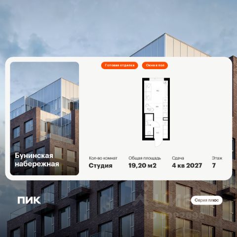 Продаётся квартира-студия площадью 19,2 кв.м на 7 этаже 16 этажного дома (Корпус 2.6/1.4, Секция 4) проекта ПИК Бунинская набережная. Светлый просторный подъезд на уровне земли, функциональная планировка, большие окна, c отделкой. Удобное расположение: 18 минут пешком от м. "Потапово" и 12 минут на автомобиле до станции "Бунинская аллея". 12 минут на автомобиле до трассы Солнцево — Бутово — Варшавское шоссе. 20 минут на автомобиле до МКАД и Калужского шоссе. 1520 минут езды до живописных парков: "Бутовский лесопарк", заказник "Южное Бутово". Особенности проекта Камерный квартал в Новой Москве, на берегу Ивановского пруда. Одна из ключевых особенностей проекта — квартиры с панорамным видом на воду. Архитекторы вдохновились локацией проекта: природные оттенки и активная пластика корпусов напоминают рельефные выступы на берегу, а окна отражают водную гладь, визуально объединяя дома с природой. Преимущества проекта Светлые и просторные лобби с зонами ожидания. Подземный паркинг. Набережная и пешеходная аллея для прогулок. Парк на склоне с игровой зоной. Готовая инфраструктура района: 3 школы, 6 детских садов, взрослая и детская поликлиники. Артикул 969058