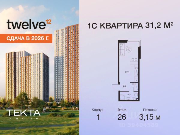 Рассрочка 0% с платежом от 120 000 ₽ в месяц. Сдача уже в 2026 году 1-комн. квартира-студия в ЖК "Твелв" на 26 этаже в 34 этажном здании Корпус 1. Общая площадь: 31.2 кв.м., жилая: 14.20 кв.м. Высота потолков 3.15 м. ЖК Твелв от застройщика Текта Групп — это новый уровень жизни в районе Нагорный в 3-х минутах от станции метро. Проект представляет собой воплощение современной концепции комфортной жизни, где функциональность органично сочетается с эстетикой. Архитектура Твелв создает атмосферу, вдохновляющую на успех и располагающую к позитивным эмоциям. Дом, в котором каждый день будет наполнен уютом, а не рутинной работой и дорожными пробками. Твелв предлагает своим жильцам продуманные планировки, возможность объединения квартир, а также увидеть красоту города через угловое остекление увеличенных окон. Особое внимание уделено комфорту жителей: благоустроенная территория, зеленые насаждения, детские площадки, парковка. ЖК Твелв — это больше, чем просто жилье: это атмосфера умиротворенности, комфорта и гармонии.