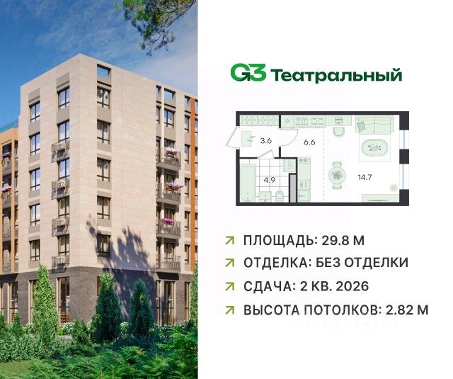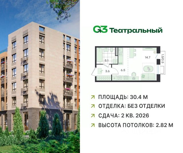 В современном квартале бизнес-класса G3 Театральный продаётся квартира-студия, общей площадью 29.4 кв.м, расположенная на 5 этаже (корпус 2, секция 7). "G3 Театральный" - это малоэтажный загородный smart business квартал, который возводится в Раменском городском округе Московской области, расположенный в окружении вековых сосен, с уникальным ландшафтным двором. Отличная транспортная доступность: - 500 метров от МЦД-3 "Ильинская"; - 8 км до выезда на Новорязанское шоссе; - 16 км от МКАД. Удачное расположение: - живая сосновая роща; - лесопарк "Треугольный" и Цаговский лес; - 12 минут на машине до городского парка; - 10 минут на машине до города Жуковский. Развивающаяся инфраструктура: На территории квартала появятся свой детский сад, спортплощадки, игровые зоны, кафе, аптеки, магазины и многое другое необходимое для жизни. В шаговой доступности находятся поликлиника, школы, детские сады, фитнес-клубы. В каждом подъезде устроены зоны для хранения колясок и велосипедов, розетки для электросамокатов, лапомойки для домашних питомцев. Ваши автомобили будут находиться на закрытой территории под круглосуточным видеонаблюдением. Паркинг с зарядкой для электромобилей. Квартиру можно приобрести по выгодным ипотечным условиям от крупнейших российских банков - Сбербанк, ВТБ, Росбанк. Ключи до сентября 2026 года.
