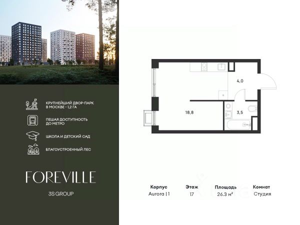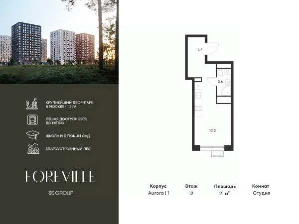 Пешая доступность от метро и московская прописка! Продается уютная студия площадью 22,8 кв.м на 13 этаже 17 этажного жилого комплекса бизнес-класса Foreville от 3S Group. Общая площадь: 22,8 кв.м., жилая: 10,7 кв.м., площадь кухни-гостиной: 5,5 кв.м., высота потолков: 2,72 м., окна выходят на улицу. [1] Квартира предлагается без отделки, что идеально подходит для воплощения собственного дизайнерского решения. Также доступна опция предчистовой отделки, стоимость которой включается в общую цену квартиры. О проекте: Пространство Комплекс располагает крупнейшим приватным двор-парком в Новой Москве площадью 1,2 Га, предлагая жителям огромное пространство для отдыха, спорта и игр на свежем воздухе. Природный ландшафт Внутренний лесопарк с более чем 183 взрослыми деревьями и 10 320 цветущими кустарниками создает уникальную природную атмосферу для каждого времени года. Игровые и спортивные зоны Обширные площадки с безопасным покрытием, специализированные зоны для детей разных возрастных групп и взрослых, включая воркаут и настольный теннис, способствуют активному и здоровому образу жизни. Экологичность и долговечность Использование натуральных материалов, таких как лиственница, и крупноформатной бетонной плитки для покрытия, подчеркивает стремление проекта к экологичности и устойчивости. Безопасность и уединение Внутренний двор без машин обеспечивает безопасность для детей и спокойствие для взрослых. Территория огорожена и находится под круглосуточным видеонаблюдением. Сохранение времени Благодаря превосходной транспортной доступности и близости к новой станции метро Корниловская, Foreville позволяет жителям экономить время для семьи и отдыха на природе, минимизируя необходимость длительных поездок. Foreville не просто жилье, а целая экосистема для комфортной и гармоничной жизни на свежем воздухе, совмещая преимущества городской инфраструктуры и непосредственную близость к природе.