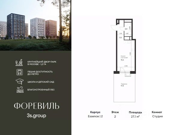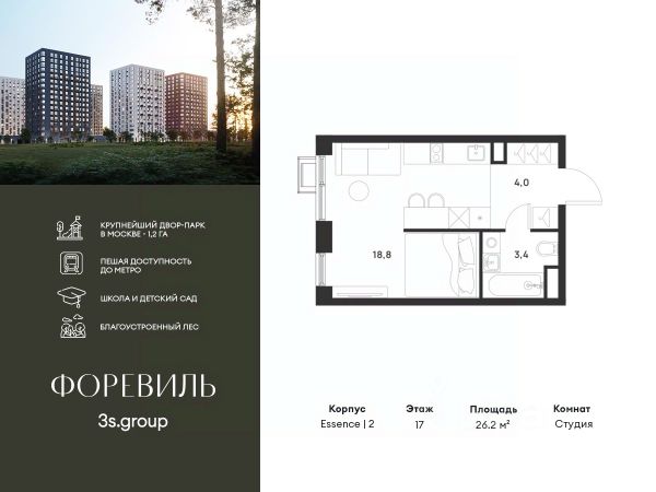 Предчистовая отделка в подарок! Пешая доступность от метро и московская прописка! Продается уютная студия площадью 24,3 кв.м на 9 этаже 17 этажного жилого комплекса бизнес-класса Foreville от 3S Group. Общая площадь: 24,3 кв.м., жилая: 11,6 кв.м., площадь кухни-гостиной: 6 кв.м., высота потолков: 2,72 м., окна выходят во двор. Квартира предлагается без отделки, что идеально подходит для воплощения собственного дизайнерского решения. Также доступна опция предчистовой отделки, стоимость которой включается в общую цену квартиры. О проекте: Пространство Комплекс располагает крупнейшим приватным двор-парком в Новой Москве площадью 1,2 Га, предлагая жителям огромное пространство для отдыха, спорта и игр на свежем воздухе. Природный ландшафт Внутренний лесопарк с более чем 183 взрослыми деревьями и 10 320 цветущими кустарниками создает уникальную природную атмосферу для каждого времени года. Игровые и спортивные зоны Обширные площадки с безопасным покрытием, специализированные зоны для детей разных возрастных групп и взрослых, включая воркаут и настольный теннис, способствуют активному и здоровому образу жизни. Экологичность и долговечность Использование натуральных материалов, таких как лиственница, и крупноформатной бетонной плитки для покрытия, подчеркивает стремление проекта к экологичности и устойчивости. Безопасность и уединение Внутренний двор без машин обеспечивает безопасность для детей и спокойствие для взрослых. Территория огорожена и находится под круглосуточным видеонаблюдением. Сохранение времени Благодаря превосходной транспортной доступности и близости к новой станции метро Корниловская, Foreville позволяет жителям экономить время для семьи и отдыха на природе, минимизируя необходимость длительных поездок. Foreville не просто жилье, а целая экосистема для комфортной и гармоничной жизни на свежем воздухе, совмещая преимущества городской инфраструктуры и непосредственную близость к природе.