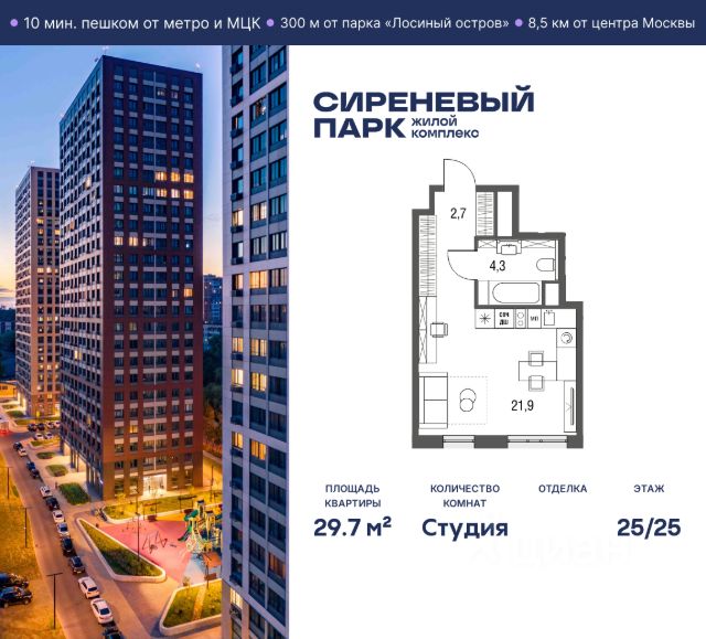 Продаётся просторная студия общей площадью 23.8 м² на 25 этаже в новом жилом комплексе "Сиреневый парк", расположенном в Восточном административном округе Москвы на улице Тагильская. Всего 10 минут ходьбы от станции метро "Бульвар Рокоссовского" и одноимённой платформы МЦК. Высококачественное монолитное строительство гарантирует сохранение тепла в доме, а наличие квартир с предчистовой и чистовой отделкой позволяет вам сэкономить время и сразу же переехать в свое жилье после покупки. Благодаря разнообразию планировок вы сможете выбрать идеальный вариант, соответствующий вашим предпочтениям и образу жизни. Предлагаются квартиры: - с просторными кухнями-гостиными, - с нишами для хранения вещей и отдельными гардеробными, - мастер-спальни с собственными санузлами, - большие комнаты с высокими потолками (2,9 м) и с увеличенными безопасными окнами (1,95 м) , которые наполнят ваш дом естественным светом; - с чистовой отделкой по двум дизайн-проектам на выбор; - с остекленными лоджиями и панорамными видами на лес. Каждая деталь в этом доме создана для вашего комфорта: - безбарьерная среда, - бесшумные скоростные лифты, - машиноместа в отапливаемом подземном паркинге и кладовые на -1 этаже с доступом из лифта, - развитая инфраструктура с супермаркетами, кафе, фитнес-клубами, салонами красоты и частным детским садом обеспечивает максимальное удобство жителям. В 300 метрах от ЖК расположен Национальный парк "Лосиный остров". Способы покупки: 100%, Рассрочка 0% от застройщика, Trade-in, Семейная ипотека без наценки, стандартная ипотека. Запишитесь на просмотр в офис продаж и получите свою персональную скидку по акции Назови свою скидку. ЖК "Сиреневый парк" — гармония в деталях, совершенство в каждом моменте. Застройщик проекта - AFI Development.