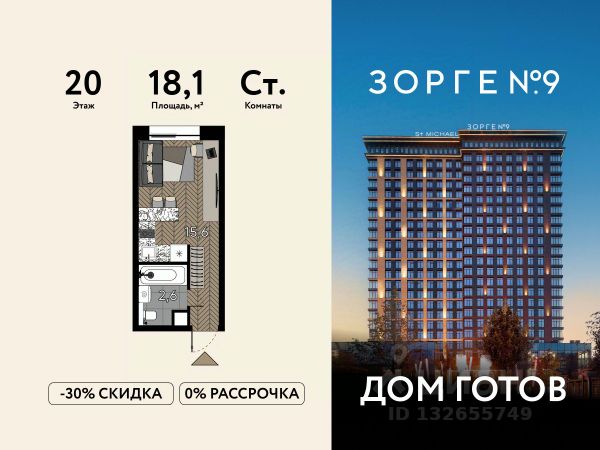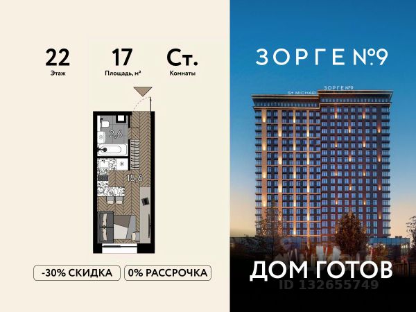 "Зорге 9" — готовые апартаменты бизнес-класса на Ходынке. 10 минут до Москва-Сити. Архитектура: 3 современных корпуса с фасадами в стиле архитектуры Нью-Йорка и с сервисами премиальных отелей, высотой до 23 этажа. Строгие линии, панорамные окна создают ощущение неподдельной роскоши и комфортной жизни в сердце мегаполиса. Проект награжден авторитетной премией European Property Awards. Резиденции: Свободная планировка, небольшая глубина этажа, огромные панорамные окна в пол до 3,6 м и высота потолков до от 3,3 до 4,3 м позволяют реализовать самые смелые концептуальные идеи и создать идеальный интерьер с учетом всех пожеланий. Вдохновляющие виды на город украсят ваш апартамент лучше любой картины. Есть возможность приобретения дизайн-проекта и полной меблировки апартаментов от партнеров девелопера. Расположение: 3 мин. пешком до парка Березовая роща 10 мин. пешком до Ходынского поля 10 мин. до ТЦ Авиапарк 30 минут до Шереметьево 10 мин до Москва-Сити или 1 станция до Москва-Сити 5 минут до ТТК 4 станции метро в шаговой доступности: 6 мин м. Полежаевская (фиолетовая ветка) 7 мин МЦК Зорге (МЦК) 7 мин м. Хорошевская (голубая ветка) 10 мин МЦК Хорошёво (МЦК) Благоустройство: Собственный парк 2 га с амфитеатром и поющими фонтанами. В парке высажено 136 деревьев и более 11 000 кустов и мелких растений из немецких питомников. Площадка для йоги и воркаут-зона со спортивными площадками. Теннисные столы и детский плейхаб Две башни Авторское гранд-лобби В лобби предусмотрена лаундж-зона, чайная с камином, комната для хранения велосипедов и колясок. Доступ по системе FACE ID. В отделке лобби и лифтовых холлов использован декоративный камень итальянского бренда Atlas Concorde Пентхаусы На верхнем уровне комплекса расположены роскошные просторные пентхаусы с высотой потолка до 4,2 метра и панорамными окнами до 3,6 метров, открывающими великолепные виды на столицу. Пентхаусы с выходами на собственные приватные террасы на кровле, площадью от 150 кв. м являются жильем high-уровня, демонстрирующим высокий статус владельца.