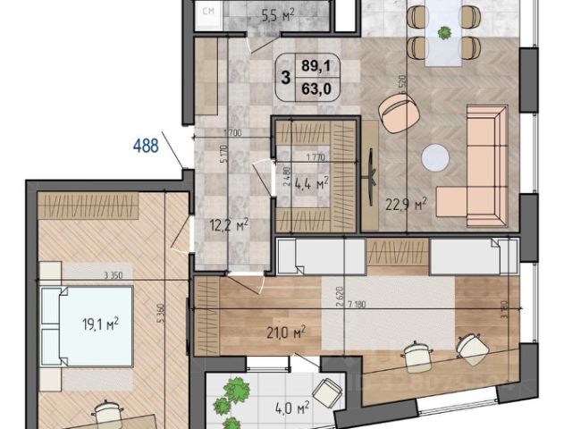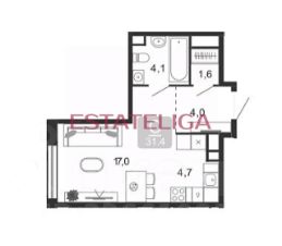Удобное планировочное решение квартиры : просторная кухня-гостиная, уютная спальня с вместительным шкафом, гардеробная, совмещенный с/у с душевой кабиной и прихожая.