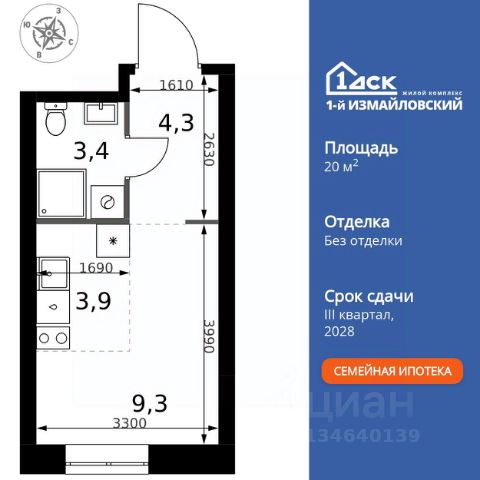Прямая продажа от застройщика! Жилой Комплекс Комфорт класса. Продаётся квартира-студия номер 177 общей площадью 19.9 кв.м. на 3-м этаже 25 этажного здания. Без отделки. Цена с учётом скидки. Особенности квартиры: - Организуем показ в удобное для вас время! - Линейная планировка - максимальная функциональность и удобство. - Можно оборудовать рабочее место - комфорт для работы и учёбы. - Ниша под шкаф - компактное и удобное место для вещей. Квартира без отделки. Чистый холст для воплощения интерьера вашей мечты. Информация о комплексе: ЖК "1-й Измайловский" в восточной части Москвы: идеальное место для жизни в окружении 14 000 гектаров леса. Наслаждайтесь лыжными прогулками зимой и пробежками летом в сиреневом саду и лесопарках. Комплекс отгорожен от шоссе застройкой первой линии и садами здоровья. Из окон открываются виды на парк "Лосиный остров" и зеленые дворы. Близость к природе и спортивным объектам создаёт атмосферу здорового образа жизни. Транспортная доступность: Не более 2,5 км до станций метро "Щёлковская" и "Черкизовская" и МЦК "Локомотив". Щёлковское шоссе соединяет квартал с Северо-восточной хордой и МКАД, Центральным автовокзалом и Восточным железнодорожным вокзалом. Две автобусные остановки в паре минут ходьбы и 11 маршрутов общественного транспорта. На автомобиле 3 минуты до СВХ 12 минут до ТТК 15 минут до Садового кольца Внутренняя инфраструктура: ЖК расположен в историческом районе Москвы с развитой инфраструктурой. В шаговой доступности: 6 детских садов (включая собственный на 125 мест), 3 школы, поликлиники, торговые центры и парки. Проект создан для здорового образа жизни: рядом стадионы, спортивные объекты для футбола, баскетбола и конного спорта, а также более 30 км беговых и велодорожек. Всё для активной жизни в окружении зелени и современной инфраструктуры. Квартира без отделки - чистый холст для вашего интерьера. Квартира-студия в районе Гольяново в Москве.