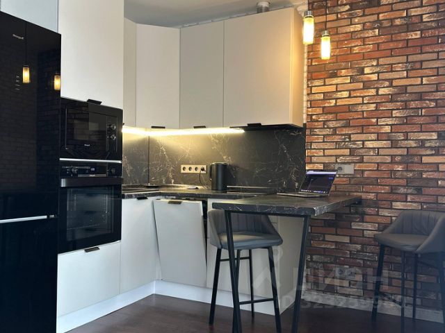 В квартире выполнен дизайнерский ремонт в темных тонах с использованием дорогостоящих строительных и отделочных материалов, при этом студия остается светлой и просторной. Квадратура используется максимально эффективно за счет детально продуманного дизайн-проекта и сделанной на заказ мебели.