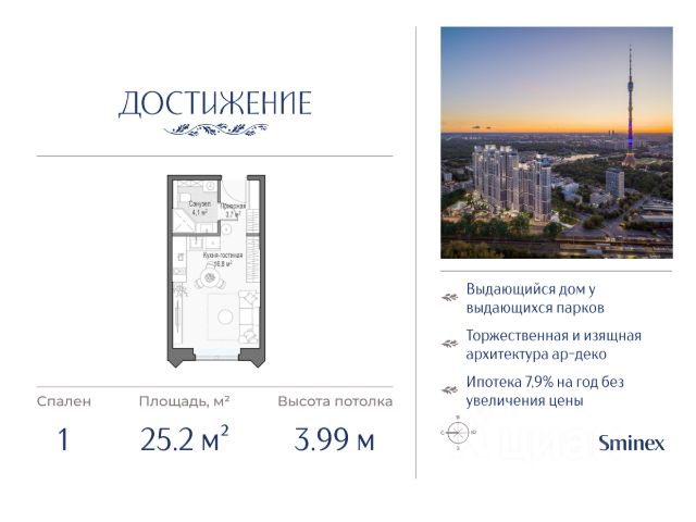 Продаётся студия площадью 26.2 кв.м на 4 этаже 55 этажного корпуса Эльбрус в квартале небоскребов "Upside Towers". В квартире отделка White-box, c видом на детский сад, БЦ Останкино. Номер квартиры А0402. Upside Towers - технологичный квартал строится в динамично развивающемся Бутырском районе, в 3 мин. от метро, в 5 мин. от ТТК. На территории 7 га возводится 5 высотных башен от 19 до 58 этажей, названных в честь главных вершин земли. Квартиры с панорамными окнами в пол, высокими потолками и современными инженерными решениями. Благоустроенная зеленая территория включает: приватные дворы, природный комплекс, прогулочный бульвар, ландшафтный парк 2,5 га с сенсорным садом и многофункциональными игровыми и спортивными площадками. Большое внимание в проекте уделяется созданию социальной инфраструктуры. Более 2000 кв.м. отдано под Upside club закрытый клуб, уникальное пространство для общения и развития жителей квартала, включая SKY SPA Relax на 47 этаже башни "Атлас" расслабляющей атмосферой, джакузи, сауной, залами для релаксации и йоги доступное жителям Upside Towers, всесезонное барбекю-патио, лаундж зону с камином и роялем, многофункциональные игровые пространства, домашний кинотеатр, коворкинг и переговорные. В башнях откроются смотровые террасы для резидентов с панорамными видами на город, парки, Останкинскую башню, ВДНХ, Ботанический сад и Москву-Сити. В рамках проекта строится государственная школа и детский сад, разместится более 15 000 кв.м. коммерческой инфраструктуры. Насыщенная социальная инфраструктура формирует множество сценариев для жизни на территории квартала. В Upside Towers применяются лучшие технологии и практики, чтобы обеспечить высшее качество жизни: Воздух, не уступающий по качеству горному, обеспечит приточно-вытяжная вентиляция. Пятиступенчатая очистка воды с сохранением полезных минералов. Центральное кондиционирование. Внутрипольные конвекторы с естественной конвекцией. Современные системы безопасности и мониторинга микроклимата. Высокоскоростной интернет на всей территории, в квартирах и паркинге за счет усиления GSM-связи всех ведущих операторов. Все места в подземном паркинге оборудованы зарядками для электрокаров. Бутырский район непрерывно развивается и готовится стать новым современным деловым районом Москвы. В рамках программы "Индустриальные кварталы" комплексного развития территории Огородного проезда будут построены современные образовательные и спортивные учреждения, торговые центры, кафе, банки, общественно-деловые здания и другие объекты. В пешей доступности работают школы, детские сады, поликлиники, аптеки, супермаркеты и многое другое. Рядом находится несколько крупных зелёных зон для спокойного отдыха: Парк Останкино, ВДНХ, Парк Сокольники, Гончаровский парк, в 15 минутах пешком располагаются знаменитые арт-пространства - дизайн-завод Flacon и "Хлебозавод". Время в пути на автомобиле до центра Москвы 15 минут. (Застройщик ООО "СЗ "К-Девелопмент") Продается квартира-студия рядом с метро Фонвизинская.