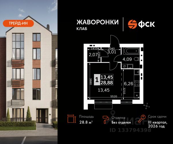 —функциональная планировка: комната с кухонной зоной и выходом на лоджию-ПАТИО, совмещённый санузел, прихожая. Площадь по ЕГРН — 27,4 кв. м. без учёта лоджии.