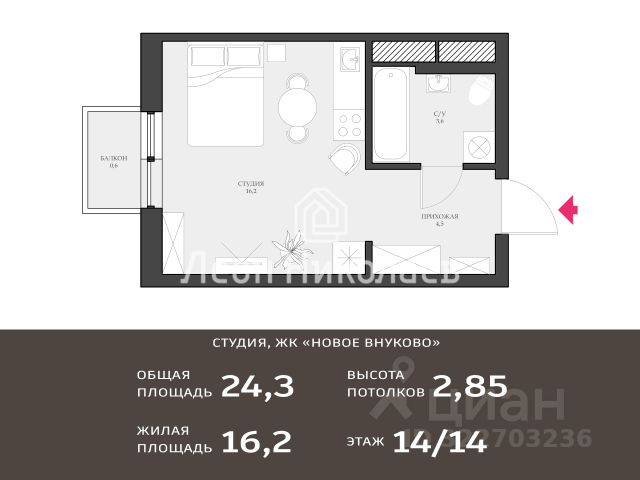 Просторная уютная студия площадью 24,3 м2 с качественным ремонтом в авторском стиле. Высокие потолки - 2,85 м. Студия очень теплая. В квартире выполнены следующие работы: установлена новая качественная входная дверь с тепло и шумоизоляцией, заменена металлическая ванна на акриловую, заменены трубы в ванной, вырезан лючок, повешено большое зеркало с подсветкой, переставлен унитаз, с помощью альпиниста устранена течь на балконе сверху, покрашен потолок балкона, сделан наливной пол, повешен карниз-струна, демонтированы железные прутья, установлена сплит-система, сделан слив конденсата, переустановлена балконная дверь со сменой всех резинок и уплотнителей, одно окно снизу заменено на открывающееся для чистки внешнего блока, установлены 3 сетки и солнцезащитные пленки, повешены люстры и картины, установлена модульная кухня Амика, столешница с влагостойкой защитой, врезана индукционная плита Hyundai, вытяжка Hansa, фильтры аквафор, холодильник Haier, стильная свч. Собраны: шкаф для одежды, шкаф под стиральную машину, комод Home, комод, витрина и тумбочка ikea, полноценная кровать Moon с новым матрасом, уютное кресло, мягкие стулья, в ванной установлена стиральная машина Samsung, в прихожей большое зеркало, новый и качественный текстиль.
