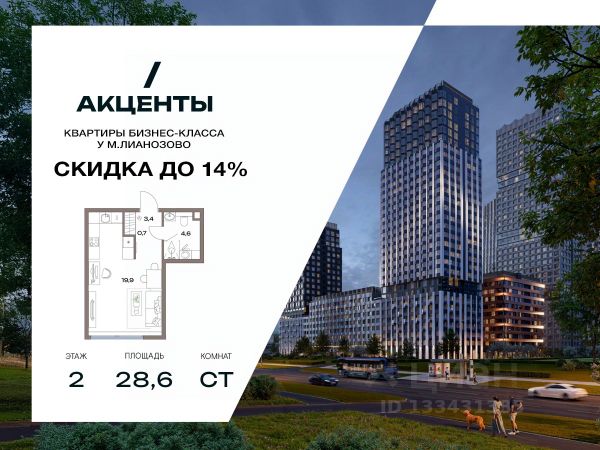 Смарт-студия для молодых специалистов или тех, кто ценит личное пространство и независимость. -Свободная линейная планировка, где гармонично зонирована кухня и спальня -В квартире предусмотрено панорамное остекление -Возможность установки дополнительной перегородки для разделения -Вместительная система хранения в коридоре Смарт-студия подойдет тем, кто ищет функциональное и доступное жилье. Молодой район для жизни "Акценты" в классе бизнес-лайт — точка роста на севере Москвы. Он предлагает элегантные и строгие фасадные решения, авторский ландшафтный дизайн, а также функциональные и доступные по цене планировки. Проект находится в семи минутах пешком от станции метро "Лианозово" и одноименной МЦД-1. Добраться до МКАД можно будет за 10 минут на авто, а дорога до центра займет около 20 минут. Жилой комплекс, расположенный в районе Восточного Дегунино, предлагает развитую инфраструктуру для тех, кто ценит выбор. Он имеет удобный доступ не только к транспорту, но и к паркам, школам, садам, больницам и другим социальным объектам. В пешей доступности находятся 4 поликлиники, 5 школ, 6 детских садов, 3 бассейна и баскетбольная академия. Еще рядом есть несколько лесопарков: "Лианозово" с аттракционами и спортивными площадками для тенниса, волейбола и баскетбола, "Останкино" с конным клубом, прудом и пейнтбол-площадками. А "Северные Дубки" — это завораживающее пространство для прогулок под кронами вековых дубов, берез и лип. Кроме того, в районе не будет скучно и юным жителям. Можно оттачивать трюки в скейтпарке "Союз". Ловким и прыгучим советуем записаться в акробатический центр "Белка".