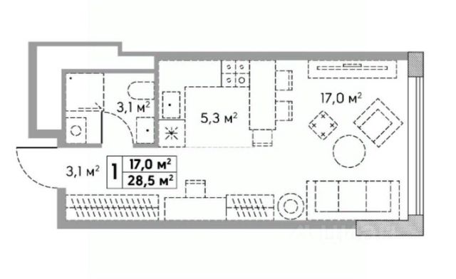 Квартира-студия объединяет в себе два основных пространства - кухню и жилую часть. Установлены энергоэффективные окна Schuco, высотой 2,7 с функцией проветривания. В санузле предусмотрено место для ванны. Возможно подключение к системе кондиционирования VRV.На этаже расположены кладовые помещения. В комплексе предусмотрена система очистки воды.