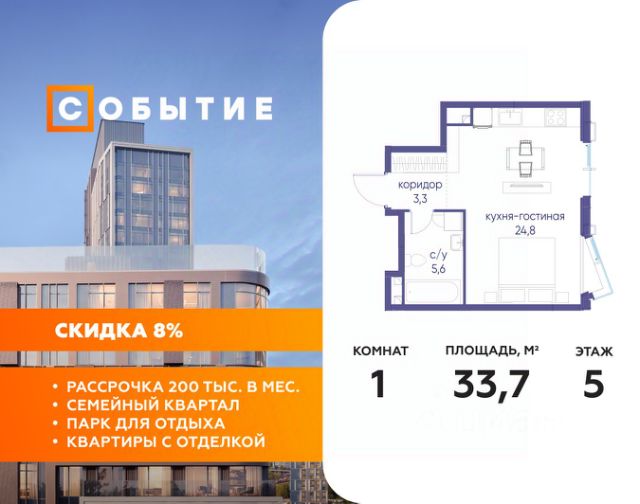 В продаже студия от застройщика. Общая площадь 33.70, жилая 18.60, кухня 6.2. Квартира расположена на 5 этаже жилого квартала "Событие-6", корпус 2, 2. Квартира без отделки. Срок сдачи: 4 кв. 2029 года. СОБЫТИЕ.6 — финальный дом парк-квартала СОБЫТИЕ на Мосфильмовской. Переезжайте в уже сформированный квартал с готовой инфраструктурой и парком! Премиальный жилой комплекс в престижном районе Москвы предлагает стильную архитектуру, продуманное благоустройство и великолепно разнообразие общественных пространств. Свой парк прямо возле дома! Архитектура Архитектура СОБЫТИЯ.6 выполнена в ультрасовременном стиле московским бюро Atrium на основе дизайн-кода британских архитекторов LDA Design и UHA London. Дом отличает оригинальная геометрия фасадов, большое остекление и высокие лобби (до 6,2 м) с авторской мебелью и светильниками. Расположение Мосфильмовская улица (Раменки) — один из престижных районов Москвы. Близость к историческому и деловому центру, природным зонам Запада столицы. Транспортная доступность: • 10 мин до Москва-Сити и ТТК; • 15 мин до Садового кольца; • 25 мин до аэропорта Внуково; • 7-10 мин до станций метро "Аминьевская" и "Мичуринский проспект". Инфраструктура: • парк "Событие" (12 га, финалист конкурса Правительства Москвы) с беговыми (1,5 км) и велодорожками (2,7 км), экотропой (1,6 км), площадками, лекторием; • школа, детский сад, магазины, салоны красоты, рестораны (к моменту заселения); • мультидвор с игровыми и спортивными площадками, мини-бульваром; • общественная терраса на 10-м этаже (коворкинг, лаунж); • Закрытые общественные пространства: детская комната, спортивный зал, коворкинг, лаунж-зоны. Паркинг 256 мест для жителей (48 — для электромобилей), 24 гостевых (5 — для электромобилей), мойки колес, кладовые, зоны для велосипедов. Окружение Парки и заповедники (Воробьёвы горы, Матвеевский лес и др.), МГУ, театр им. Н. И. Сац, стадион "Лужники". Безопасность Видеонаблюдение, контроль доступа, видеодомофоны, консьерж-сервис 24/7, системы пожарной безопасности и мультисервисная оптическая сеть.