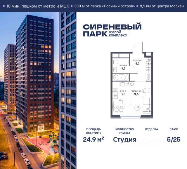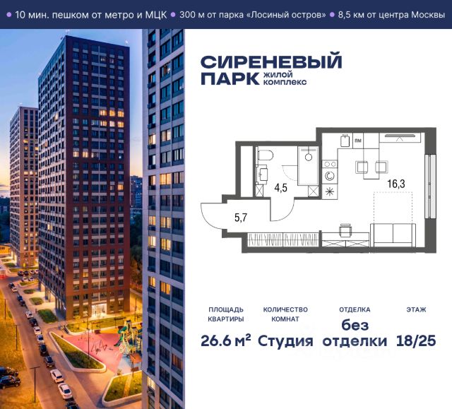 Продаётся просторная студия общей площадью 24.9 м² на 5 этаже в новом жилом комплексе "Сиреневый парк", расположенном в Восточном административном округе Москвы на улице Тагильская. Всего 10 минут ходьбы от станции метро "Бульвар Рокоссовского" и одноимённой платформы МЦК. Высококачественное монолитное строительство гарантирует сохранение тепла в доме, а наличие квартир с предчистовой и чистовой отделкой позволяет вам сэкономить время и сразу же переехать в свое жилье после покупки. Благодаря разнообразию планировок вы сможете выбрать идеальный вариант, соответствующий вашим предпочтениям и образу жизни. Предлагаются квартиры: - с просторными кухнями-гостиными, - с нишами для хранения вещей и отдельными гардеробными, - мастер-спальни с собственными санузлами, - большие комнаты с высокими потолками (2,9 м) и с увеличенными безопасными окнами (1,95 м) , которые наполнят ваш дом естественным светом; - с чистовой отделкой по двум дизайн-проектам на выбор; - с остекленными лоджиями и панорамными видами на лес. Каждая деталь в этом доме создана для вашего комфорта: - безбарьерная среда, - бесшумные скоростные лифты, - машиноместа в отапливаемом подземном паркинге и кладовые на -1 этаже с доступом из лифта, - развитая инфраструктура с супермаркетами, кафе, фитнес-клубами, салонами красоты и частным детским садом обеспечивает максимальное удобство жителям. В 300 метрах от ЖК расположен Национальный парк "Лосиный остров". Способы покупки: 100%, Рассрочка 0% от застройщика, Trade-in, Семейная ипотека без наценки, стандартная ипотека. Запишитесь на просмотр в офис продаж и получите свою персональную скидку по акции Назови свою скидку. ЖК "Сиреневый парк" — гармония в деталях, совершенство в каждом моменте. Застройщик проекта - AFI Development. Квартира-студия рядом с метро Партизанская.