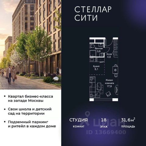 Продается квартира от надежного застройщика Tashir Estate в квартале бизнес-класса Stellar City в ЗАО Москвы. Площадь квартиры составляет: 30.8 кв. м, потолки: 3.1 м Квартира находится на 5 этаже, 4 корпуса жилого квартала Stellar City — микрогорода будущего на орбите Москвы. Stellar City — квартал в ЗАО Москвы вблизи инновационного центра Сколково. В окружении — 11 парков и природных зон, в том числе Долина реки Сетунь, Мещерский лес и парк развлечений The Rink. Город в городе Чтобы дом и инфраструктура вокруг отвечала динамичному лайфстайлу жителя мегаполиса, в основу проекта легла концепция город в городе, которая позволяет решать все бытовые вопросы in-home. В квартале будут возведены школа и детский сад, воркаут-зоны, променад, вело и беговые дорожки, детские площадки для каждого корпуса, а также коммерция на первых этажах для ежедневных покупок. Все необходимое — на расстоянии нескольких шагов. Изящные и лаконичные лобби Авторский дизайн, натуральные материалы в отделке и безупречный интерьер вне времени. Лобби и холлы в проекте бизнес-класса Stellar City ничем не отличаются от входных групп в премиум-сегменте благодаря качественным европейским материалам в отделке, стильному дизайну, консьерж-сервису и уютной зоне ожидания с журнальными столиками и мягкой мебелью. Комфорт и безопасность Закрытая территория, охрана, система СКУД, специально разработанное мобильное приложение дома для резидентов и подземный паркинг с круглосуточным наблюдением и доступом с помощью автоматического считывания номера авто.