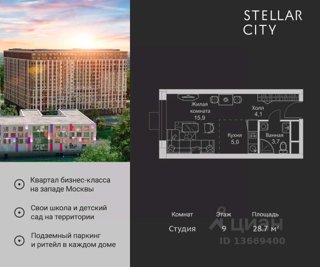Продается квартира от надежного застройщика Tashir Estate в квартале бизнес-класса Stellar City в ЗАО Москвы. Площадь квартиры составляет: 28.7 кв. м, потолки: 3.1 м Квартира находится на 8 этаже, 4 корпуса жилого квартала Stellar City — микрогорода будущего на орбите Москвы. Stellar City — квартал в ЗАО Москвы вблизи инновационного центра Сколково. В окружении — 11 парков и природных зон, в том числе Долина реки Сетунь, Мещерский лес и парк развлечений The Rink. Город в городе Чтобы дом и инфраструктура вокруг отвечала динамичному лайфстайлу жителя мегаполиса, в основу проекта легла концепция город в городе, которая позволяет решать все бытовые вопросы in-home. В квартале будут возведены школа и детский сад, воркаут-зоны, променад, вело и беговые дорожки, детские площадки для каждого корпуса, а также коммерция на первых этажах для ежедневных покупок. Все необходимое — на расстоянии нескольких шагов. Изящные и лаконичные лобби Авторский дизайн, натуральные материалы в отделке и безупречный интерьер вне времени. Лобби и холлы в проекте бизнес-класса Stellar City ничем не отличаются от входных групп в премиум-сегменте благодаря качественным европейским материалам в отделке, стильному дизайну, консьерж-сервису и уютной зоне ожидания с журнальными столиками и мягкой мебелью. Комфорт и безопасность Закрытая территория, охрана, система СКУД, специально разработанное мобильное приложение дома для резидентов и подземный паркинг с круглосуточным наблюдением и доступом с помощью автоматического считывания номера авто. Продам квартиру-студию рядом с метро Сколково.