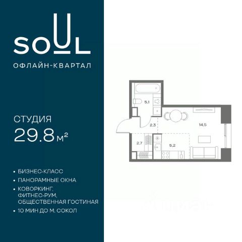 Цены указаны с условием 100% оплаты и стандартной ипотеки. Прямая продажа от застройщика! Продается студия квартира номер 666 общей площадью 33.3 кв.м. на 9-м этаже 24 этажного дома, Корпус 9. С отделкой White Box Max. Проект бизнес-класса SOUL от девелопера FORMA. До метро Сокол 10 мин пешком. Архитектура от британского бюро SimpsonHaugh. Благоустройство дворов — Gillespies и GAFA. Территория состоит из культурного парка и приватных дворов. Озеленение в эстетике лесного оазиса. Насыщенное благоустройство: прогулочные тропинки, релакс-зоны, пряный и сенсорный сады, развивающие детские площадки и воркауты. В центре проекта объект культурного наследия — общественное пространство Изофабрика, построенная в 30-х годах по проекту архитектора Георгия Гольца. Здесь будут располагаться мастерские для взрослых и детей, выставочные залы, коворкинги, образовательный центр, рестораны и кафе. Квартиры с панорамными окнами, мастер-спальнями, гардеробными, классическими балконами и лоджиями, видовыми террасами. Высота потолков от 2,9 до 3,5 м. В проекте 2 детских сада на 100 и 200 малышей. Клубная гостиная, фитнес-рум, детская игровая комната, дизайнерские лобби, подземный паркинг и келлеры. Квартира-студия рядом с метро Сокол.