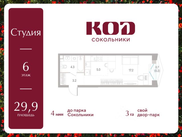 В семейном жилом квартале, расположенном в окружении более 500 га леса и объектов исторического наследия, продается студия площадью 30.6 кв. м без отделки. Квартира расположена на 2 этаже 12-этажного корпуса 2.1 жилого квартала бизнес-класса КОД Сокольники от девелопера Новая Эра. Отличная транспортная доступность - 3 мин. пешком до станции МЦД-3 "Митьково"; - 7 мин. пешком до станции метро "Сокольники"; - Удобный выезд на Русаковскую улицу; - 5 мин. на авто до ТТК; - 15 мин. на авто до Садового кольца. Продуманный архитектурный проект - Выразительная архитектура, созданная бюро "Остоженка"; - 70% квартир в квартале - видовые, что позволяет ежедневно наслаждаться панорамами на парк Сокольники, Останкинскую телебашню, исторический центр и Алексеевский монастырь; - 30% квартир - угловые. Увеличенные оконные проемы, панорамное остекление и продуманное расположение комнат усиливают эффект обзорности: гостиные и спальни получают максимум дневного света и живописные виды, которые становятся частью интерьера; - Высокие потолки от 3 метров в типовых планировках; - Дизайнерские лобби от модной студии 211.Studio; - Двухуровневый паркинг с подогреваемой рампой и пологим заездом, подходящим даже для спорткаров; Расположение Семейный жилой квартал КОД Сокольники - это дома бизнес-класса в престижном районе Сокольники. Район отличает хорошая транспортная доступность: несколько минут пешком до станции метро "Сокольники" и платформы МЦД-3 ("Митьково"), регулярные трамвайные и автобусные маршруты, удобный выезд на Русаковскую улицу и Третье транспортное кольцо. До Садового кольца можно доехать за 15 минут. Для пешеходов и велосипедистов в парковой зоне будут оборудованы широкие тротуары и велодорожки, обеспечивая комфортные условия для активного образа жизни. Внутренняя инфраструктура Резидентам будет доступна развитая клубная инфраструктура: собственный фитнес-рум, коворкинг с панорамным видом на парк, игровая комната для детей, пространства для мастер-классов и просторная гостиная, которую можно использовать для отдыха, просмотра кино или проведения мероприятий. На первых этажах жилых домов разместятся объекты стрит-ритейла: кафе, рестораны, магазины и различные сервисы - от аптек и салонов красоты до ателье и барбершопов. Рядом с жилыми корпусами появится деловой квартал с офисами и торговыми площадями на 75 тысяч кв. м, что делает проект привлекательным для тех, кто ценит возможность жить и работать поблизости. Благоустройство Центральным элементом квартала станет благоустроенный двор-парк площадью 3 га с собственным прудом и зелеными зонами для прогулок и отдыха. В границах двора предусмотрены современные игровые и спортивные площадки: мультифункциональная зона воркаута, площадки для волейбола и стритбола, площадки для пилатеса и йоги, скалодром, а также беговые и веломаршруты. В состав проекта войдет образовательный центр, включающий детский сад для 350 малышей, а также школу на 650 учеников.