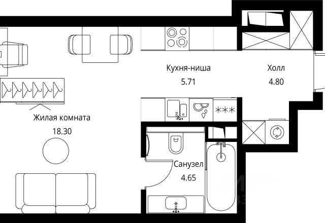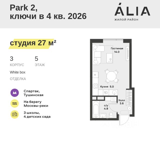 Прямая продажа от застройщика. Продаётся студия общей площадью 26.70 м² без отделки в ЖК City Вау, квартале Pacific, на 39-м этаже 59 этажного дома. Концепция жилого комплекса City Вау - настоящий город в городе с отлично развитой инфраструктурой и собственной благоустроенной набережной. На территории жилого комплекса расположено пять кварталов - Atlantic, Pacific, Indian, North, Cliff. Жилой квартал City Вау отличается оригинальной концепцией и выделяется среди других проектов такими характеристиками как: - Архитектура, - Виды из окон, - Природное окружение, вызывая гордость у жителей и восхищение у прохожих. Вся жизнь района Покровское-Стрешнево строится вокруг водных объектов: - Пойма реки Сходни с уникальной экосистемой, - Речка Химка и Химкинское водохранилище, - Москва-река, - Канал имени Москвы. Кругом вода, и местные с удовольствием этим пользуются. А сразу за рекой - центр водного спорта в Строгино с вейк-парком и яхт-клубами. Помимо воды, здесь очень много зелени: - Рядом Сходненский ковш памятник природы, естественный амфитеатр глубиной 40 метров; - Парк при усадьбе Братцево с фруктовым садом; - Дубовая роща "Маяк", - Алешкинский лес; - Лесопарк Покровское-Стрешнево с пляжами и бобрами. Главные транспортные артерии района: - Волоколамское шоссе, - Таганско-Краснопресненская линия метро и МЦД-2. Всего за 20 минут можно добраться до центра на машине или метро, а МЦД связывает ЖК City Вау с северными, восточными и юго-восточными районами. Компания MR Group предлагает своим клиентам специальные условия приобретения квартир в рамках программ ипотечного кредитования от банков-партнеров. Продам квартиру-студию рядом с метро Трикотажная.