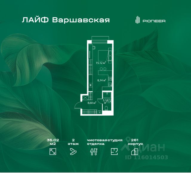 В районе Москворечье-Сабурово продается студия площадью 35.02 м². Она расположена на 2 этаже в 261 корпусе нового жилого квартала LIFE Варшавская. Площадь комнат: спальня — 15,12 м² кухня — 8,14 м² ванная — 3,16 м² В LIFE Варшавская мы создали идеальные условия для жизни молодых людей и семей с детьми, тинейджеров и спортсменов, домохозяек и бизнесменов. Жилой квартал LIFE Варшавская удачно расположен: 5 минут до станции "Варшавская" 10 минут до станции "Каширская" 18-25 минут до парка-усадьбы "Коломенское", Битцевского леса и музея-заповедника "Царицыно" Богатая инфраструктура — это визитная карточка проекта. На территории работают детский сад на 160 мест и школа на 900 мест с IT-полигоном и мультифункциональным спортивным стадионом. В квартале разместились пешеходный бульвар, игровой плейхаб "Змейка", спортивный кластер с полями для футбола и волейбола, площадка для выгула животных. На первых этажах жилых домов открыты магазины, кафе и рестораны, салоны красоты, арт-галереи, сервисы бытовых услуг, медицинские центры. Концепция жилого квартала создана ведущими архитектурными бюро. Структуры малоэтажных кварталов дополняются высотными башнями-доминантами. Такой тип застройки позволил сформировать освещенную приватную территорию.