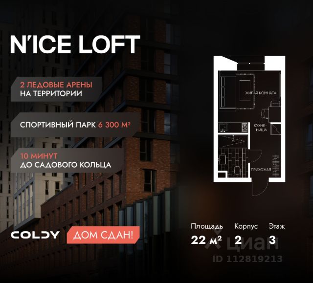 NICE LOFT — готовый жилой квартал с собственным спортивным кластером в 10 минутах от Садового кольца Комплекс апартаментов бизнес-класса NICE LOFT, девелопером которого выступила компания Coldy, представляет собой знаковое жилое пространство, на территории которого органично объединены высококачественная инфраструктура для комфортной жизни и полноценный спортивный кластер. NICE LOFT — новая спортивная доминанта Москвы, где для жителей и их гостей предусмотрено более 20 000 м², созданных специально для тренировок, игр, восстановления и оздоровления. Автором выразительной городской эстетики выступило архитектурное бюро APEX. Строгие силуэты фасадов эффектно возвышаются над благоустроенным окружением, а световые блики элегантно подчеркивают структурное фасадное остекление. Сердце проекта — физкультурно-оздоровительный комплекс с двумя ледовыми аренами формата НХЛ — профессиональными площадками. Помимо спортивных арен на территории NICE LOFT предусмотрено пять многофункциональных залов, где каждый, сможет реализовать свой спортивный потенциал. Для тех, кто предпочитает тренировки и прогулки на свежем воздухе, создан спортивный парк общей площадью 6 300 м² с воркаут-зонами, игровыми площадками и уединенными пространствами для отдыха. Также внутри квартала проложена километровая беговая дорожка, которая доступна к использованию в любое время года. Особое внимание архитекторы уделили входной группе — просторное авторское лобби с потолками до 9 метров с использованием природных элементов. Резиденты и их гости смогут насладиться садом, не покидая пределы дома. Территория апарт-комплекса NICE LOFT соответствует современным стандартам безопасности: инновационная система видеонаблюдения, охраняемый подземный паркинг и круглосуточный консьерж-сервис. Преимущества NICE LOFT: Готовый жилой квартал с собственным спортивным кластером в 10 минутах от Садового кольца Современная архитектура с выразительными контрастными фасадами Спортивная инфраструктура 20 000 м²: 2 ледовые арены формата НХЛ, 5 залов, беговая дорожка 1 км Спортивный парк 6 300 м² с зонами для разных видов активностей Более 10 видов спорта в одном кластере Апартаменты с панорамными окнами и потолками до 5 метров Видовые лоты с террасами и патио Авторское лобби с потолками до 9 метров Консьерж-сервис 24/7 Охраняемый подземный паркинг Продается квартира-студия рядом с метро Волгоградский проспект.