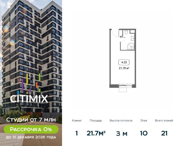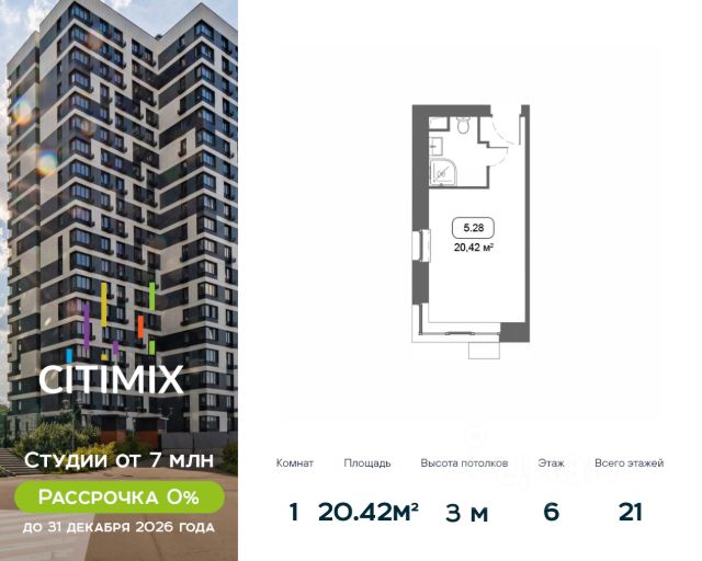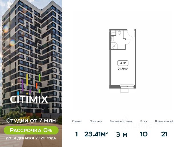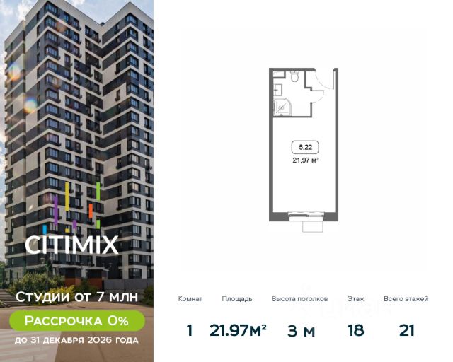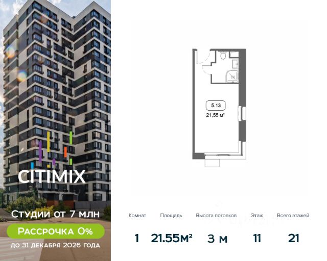 Продаётся студия в строящемся доме (Корпус 4), срок сдачи: III-кв. 2026, общей площадью 21.29 кв.м., на 15 этаже. В 2026 году запланирован перевод корпуса в жилой фонд, что позволит собственникам оформить постоянную регистрацию в Москве. МФК "CITIMIX" — студии комфорт-класса, расположенные в районе Тропарёво-Никулино в Западном административном округе Москвы. Комплекс включает в себя пять 21-этажных корпусов и собственный парк между ними. Архитектурный облик комплекса, разработанный бюро "ADM", выполнен в современном стиле, а для наружной отделки, уникальной для каждого здания, использовались керамогранитные плиты разных оттенков, витражное остекление и натуральный камень. Все студии в новостройке оснащены современным оборудованием, включая счетчики с возможностью автоматического сбора данных. Во всех подъездах спроектированы уютные лобби-зоны и индивидуальные кладовые. Наличие обширного паркинга, где могут разместиться более 650 автомобилей, позволит закрыть зеленый дворик новостройки для проезда машин и обеспечить жителям уютное, комфортное пространство для семейного отдыха. Первые этажи займут коммерческие помещения, предназначенные для социально-бытовых объектов. В 10 минутах ходьбы расположен парк Школьников, на территории которого есть Очаковские пруды и протекает река Очаковка. В пешей доступности расположен еще один зеленый массив - Тропарёвский лесопарк, занимающий площадь в 218 га. Здесь проложены дорожки для велосипедистов, роллеров и бегунов, обустроены детские площадки и зоны отдыха. Рядом с комплексом находятся детские сады, школа, медклиника, центр развития ребенка, магазины, кафе и отделения банков. Идеальный вариант для студентов, т.к. City-комплекс расположен с такими университетами, как: РАНХиГС, РУДН, РТУ МИРЭА и РНИМУ им. Н.И. Пирогова. МФК "CITIMIX" находится в 1,5 км от станции метро "Озерная" и 2,4 км от станции метро "Юго-Западная. Автомобилистам будет удобно воспользоваться выездом на МКАД (3,2 км). Застройщиком квартала выступает компания APSIS GLOBE, основанная в 2008 году. В качестве девелопера компания успешно завершила ряд инфраструктурных, коммерческих объектов на территории Московской области, Москвы, Санкт-Петербурга. Продается квартира-студия рядом с метро Юго-Западная.