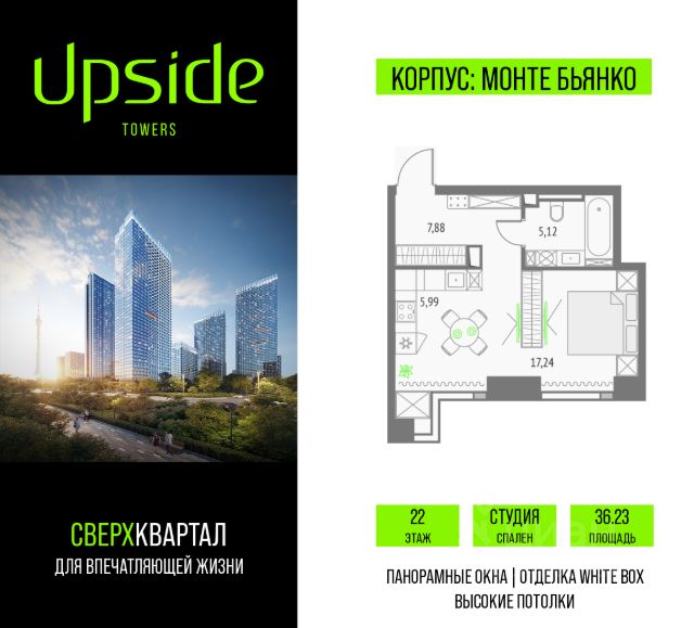 Продаётся студия площадью 33.39 кв.м на 3 этаже 19 этажного корпуса Олимп в квартале небоскребов "Upside Towers". В квартире отделка White-box, c видом на корпус Атлас, корпус Эльбрус, Гранд-плаза,. Номер квартиры В0301. Upside Towers - технологичный квартал строится в динамично развивающемся Бутырском районе, в 3 мин. от метро, в 5 мин. от ТТК. На территории 7 га возводится 5 высотных башен от 19 до 58 этажей, названных в честь главных вершин земли. Квартиры с панорамными окнами в пол, высокими потолками и современными инженерными решениями. Благоустроенная зеленая территория включает: приватные дворы, природный комплекс, прогулочный бульвар, ландшафтный парк 2,5 га с сенсорным садом и многофункциональными игровыми и спортивными площадками. В корпусе откроются магазины, кафе и рестораны, а также другие объекты коммерческой инфраструктуры. Большое внимание в проекте уделяется созданию социальной инфраструктуры. Между "Атласом" и "Олимпом" в трехэтажном стилобате разместится уникальное пространство закрытый клуб для жителей квартала Upside Club площадью 2 000 кв. м. Здесь разместятся: каминный зал с роялем, многофункциональная детская зона c двухуровневым игровым оборудованием для малышей и дошкольников, плей-рум для подростков, домашний кинотеатр, коворкинг, переговорные и лектории. На 47 этаже башни "Атлас" откроется SKY SPA Relax с расслабляющей атмосферой, джакузи, сауной, залами для релаксации и йоги. Собственники квартир смогут в любое удобное для них время забронировать посещение спа-зоны через смарт-приложение. На крыше стилобата разместится всесезонная BBQ патио-зона с верандой и закрытыми помещениями для приготовления и отдыха. В башнях откроются смотровые террасы для резидентов с панорамными видами на город, парки, Останкинскую башню, ВДНХ, Ботанический сад и Москву-Сити. Покупая квартиру даже самого минимального размера в Upside Towers, вы получаете в пользование 2 000 м² бесплатных общественных пространств. В рамках проекта строится государственная школа и детский сад, разместится более 15 000 кв.м. коммерческой инфраструктуры. Насыщенная социальная инфраструктура формирует множество сценариев для жизни на территории квартала. В Upside Towers применяются лучшие технологии и практики, чтобы обеспечить высшее качество жизни: Воздух, не уступающий по качеству горному, обеспечит приточно-вытяжная вентиляция. Пятиступенчатая очистка воды с сохранением полезных минералов. Центральное кондиционирование. Внутрипольные конвекторы с естественной конвекцией. Современные системы безопасности и мониторинга микроклимата. Высокоскоростной интернет на всей территории, в квартирах и паркинге за счет усиления GSM-связи всех ведущих операторов. Все места в подземном паркинге оборудованы зарядками для электрокаров. Бутырский район непрерывно развивается и готовится стать новым современным деловым районом Москвы. В рамках программы "Индустриальные кварталы" комплексного развития территории Огородного проезда будут построены современные обра Продается квартира-студия на проезде Огородный в Москве.