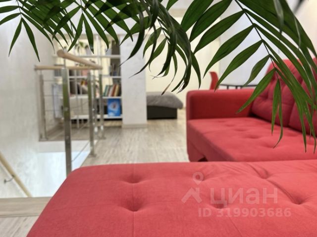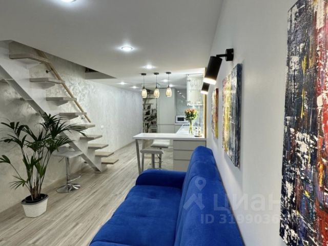 Помещение зонировано антрессолью. На первом этаже расположена входная зона с местами хранения, санузел со стиральной машиной, просторная большая кухня, со всей необходимой техникой, в том числе посудомоечной машиной. А также здесь Вы найдете ТВ-зону с двумя окнами, расположенными одно над другим, что визуально выглядит как огромное панорамное окно высотой под 5 метров. Создается ощущение, что Вы находитесь не в многоквартирном здании, а в частном доме. Тут же поместился большой телевизор и уютный диван.
