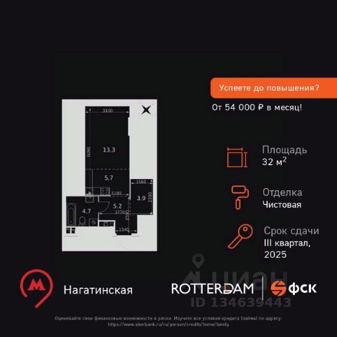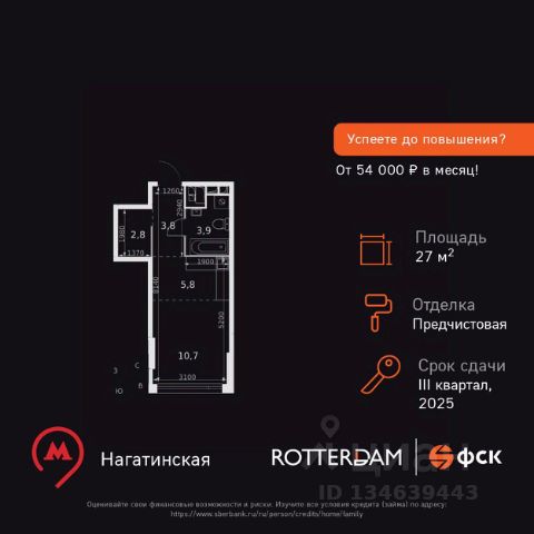 УСПЕЕТЕ КУПИТЬ ДО ПОВЫШЕНИЯ? От 54 000 рублей в месяц! Прямая продажа от застройщика! Жилой Комплекс бизнес-класса. Продаётся квартира-студия номер 190 общей площадью 27 кв.м. на 27-м этаже 29 этажного здания. Отделка Whitebox. Цена с учётом скидки. Особенности квартиры: - Линейная планировка - максимальная функциональность и удобство. - Линейная планировка - максимальная функциональность и удобство. - Увеличенная ширина окна/окон - больше света и визуального простора. - Гардеробная - удобство для хранения и организации вещей. Квартира с предчистовой отделкой (White box). Вам не придется заниматься черновыми и трудоёмкими работы, а чистовую отделку и дизайн - сделайте на свой вкус. Информация о комплексе: В ЖК Роттердам отличное расположение, которое позволит вам выбирать свой сегодняшняшний маршрут и транспорт исходя из настроения, целей и погоды. Отсюда удобно добираться в центр как на метро станция находится в пешей доступности, так и на автомобиле. Варшавское шоссе связывает жилой комплекс с ТТК, а через Люсиновскую и Мытную улицы с Садовым кольцом. В качестве альтернативного маршрута можно использовать Нагатинскую набережную: дорога вдоль Москва-реки приведет к Кремлю и Павелецкому вокзалу. Для неспешной поездки предусмотрены трамвайные маршруты, а в теплое время года веломаршруты вдоль реки. Транспортная доступность: Всего в 5 минутах пешком до метро Нагатинская и 8 минутах от МЦК Верхние Котлы. Рядом Аэроэкспресс до метро Домодево. До ТТК 2,2 км и 4,9 км до Садового кольца. Внутренняя инфраструктура: Если вы ищете идеальный баланс между отдыхом и работой и обладаете активной жизненной позицией - ЖК Роттердам вам понравится. В ЖК: зоны коворкинга, плейхаб и детские площадки для отдыха всей семьей. Близость к деловому центру Москвы, в окружении 5 парков, рядом спортивные и развлекательные центры Если вы любите живописные виды и долгие прогулки - ЖК Роттердам - отличный вариант для вас, так как он расположен прямо на Нагатинской набережной с выходом на Москву реку! В ЖК Роттердам соблюден баланс между высоткой и малоэтатажным зданием, которое не потеряло ощущение уюта и не создает впечатление городских джунглей Если вы любите быть на высоте и без ограничений - выбирайте верхние этажи Для тех, кто ценит комфорт и собственное время Для тех, кто ценит комфорт и личное пространство Для тех, кому важен комфорт, безопасность и личное пространство на предомовой территории Купить квартиру-студию станция Крымская (МЦК).