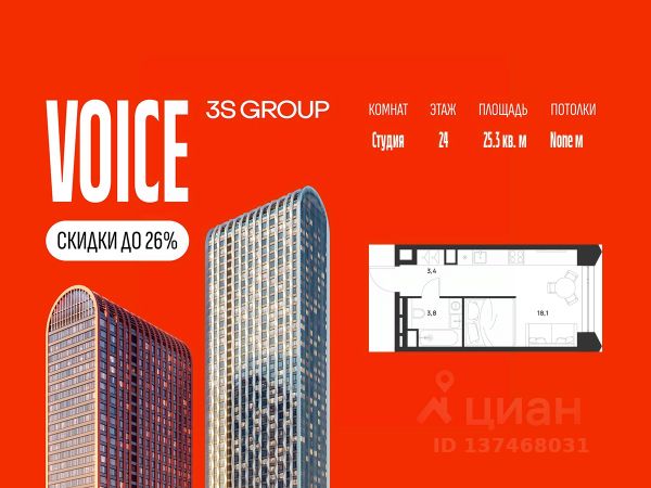 Ипотека от 3,5% на весь срок. Дополнительная скидка в офисе продаж! Продается уютная студия площадью 22,3 кв.м на 24 этаже жилого комплекса бизнес-класса Войс от 3S Group. Общая площадь: 22,3 кв.м., жилая: 12,8 кв.м., площадь кухни-гостиной: 16,2 кв.м., высокие потолки: 3,12 м., санузел совмещенный. О проекте: Войс. Высокие стандарты жизни Мы уверены, что высокие идеалы неизменно помогают достигать высот. Создавая Войс, мы ориентировались на людей с высокими требованиями к качеству и безупречным вкусом. Башни жилого комплекса, сочетают элегантную форму с динамичной геометрией фасадов, устремляются ввысь и отвечают самым высоким стандартам строительства. Технологичность, воплощенная в архитектуре - это ваш, собственный Войс. Преимущества локации Близость к метро Текстильщики, БКЛ и МЦК Новохохловская (10 мин) Рядом природный заповедник и конно-спортивная база Кузьминки-Люблино Будущее окружение Проект Южный порт - Текстильщики с деловым центром Сити-2 Небоскребы высотой до 300м Культурный центр с амфитеатром Променад вдоль Москвы-реки и яхт-клуб Архитектура Проект от Архитектурной мастерской Алексея Ильина Две перпендикулярные башни с арочными вершинами Высокая башня: светло-серый металл Низкая башня: терракотовая керамика Благоустройство Внешняя зона: парковки, магазины, кафе Внутренний двор: закрытая территория с озеленением Шумозащитный экран Сезонное озеленение Встречи на высоте Гранд-лобби высотой 8м Дизайнерская мебель Умные скоростные лифты Услуги Детский центр с игровой зоной Фитнес-студия для жителей