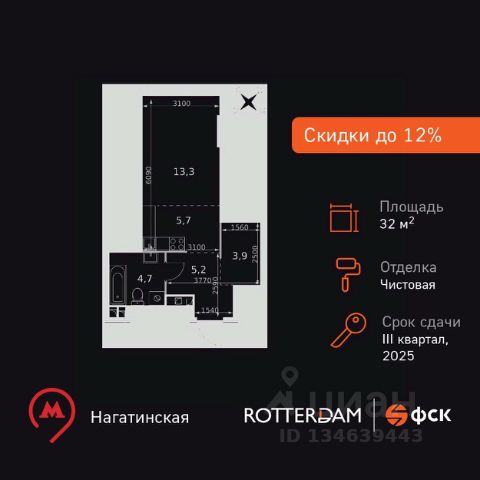 Прямая продажа от застройщика! Жилой Комплекс бизнес-класса. Продаётся квартира-студия номер 59 общей площадью 27.3 кв.м. на 9-м этаже 29 этажного здания. Отделка Whitebox. Цена с учётом скидки. Особенности квартиры: - Линейная планировка - максимальная функциональность и удобство. - Линейная планировка - максимальная функциональность и удобство. - Увеличенная ширина окна/окон - больше света и визуального простора. - Гардеробная - удобство для хранения и организации вещей. Квартира с предчистовой отделкой (White box). Вам не придется заниматься черновыми и трудоёмкими работы, а чистовую отделку и дизайн - сделайте на свой вкус. Информация о комплексе: В ЖК Роттердам отличное расположение, которое позволит вам выбирать свой сегодняшняшний маршрут и транспорт исходя из настроения, целей и погоды. Отсюда удобно добираться в центр как на метро станция находится в пешей доступности, так и на автомобиле. Варшавское шоссе связывает жилой комплекс с ТТК, а через Люсиновскую и Мытную улицы с Садовым кольцом. В качестве альтернативного маршрута можно использовать Нагатинскую набережную: дорога вдоль Москва-реки приведет к Кремлю и Павелецкому вокзалу. Для неспешной поездки предусмотрены трамвайные маршруты, а в теплое время года веломаршруты вдоль реки. Транспортная доступность: Всего в 5 минутах пешком до метро Нагатинская и 8 минутах от МЦК Верхние Котлы. Рядом Аэроэкспресс до метро Домодево. До ТТК 2,2 км и 4,9 км до Садового кольца. Внутренняя инфраструктура: Если вы ищете идеальный баланс между отдыхом и работой и обладаете активной жизненной позицией - ЖК Роттердам вам понравится. В ЖК: зоны коворкинга, плейхаб и детские площадки для отдыха всей семьей. Близость к деловому центру Москвы, в окружении 5 парков, рядом спортивные и развлекательные центры Если вы любите живописные виды и долгие прогулки - ЖК Роттердам - отличный вариант для вас, так как он расположен прямо на Нагатинской набережной с выходом на Москву реку! В ЖК Роттердам соблюден баланс между высоткой и малоэтатажным зданием, которое не потеряло ощущение уюта и не создает впечатление городских джунглей Если вы любите быть на высоте и без ограничений - выбирайте верхние этажи Для тех, кто ценит комфорт и собственное время Для тех, кто ценит комфорт и личное пространство Для тех, кому важен комфорт, безопасность и личное пространство на предомовой территории Продам квартиру-студию станция Верхние котлы (МЦК).