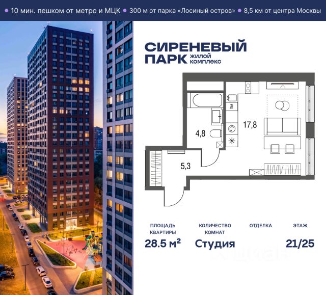 Продаётся просторная студия общей площадью 22.4 м² на 21 этаже в новом жилом комплексе "Сиреневый парк", расположенном в Восточном административном округе Москвы на улице Тагильская. Всего 10 минут ходьбы от станции метро "Бульвар Рокоссовского" и одноимённой платформы МЦК. Высококачественное монолитное строительство гарантирует сохранение тепла в доме, а наличие квартир с предчистовой и чистовой отделкой позволяет вам сэкономить время и сразу же переехать в свое жилье после покупки. Благодаря разнообразию планировок вы сможете выбрать идеальный вариант, соответствующий вашим предпочтениям и образу жизни. Предлагаются квартиры: - с просторными кухнями-гостиными, - с нишами для хранения вещей и отдельными гардеробными, - мастер-спальни с собственными санузлами, - большие комнаты с высокими потолками (2,9 м) и с увеличенными безопасными окнами (1,95 м) , которые наполнят ваш дом естественным светом; - с чистовой отделкой по двум дизайн-проектам на выбор; - с остекленными лоджиями и панорамными видами на лес. Каждая деталь в этом доме создана для вашего комфорта: - безбарьерная среда, - бесшумные скоростные лифты, - машиноместа в отапливаемом подземном паркинге и кладовые на -1 этаже с доступом из лифта, - развитая инфраструктура с супермаркетами, кафе, фитнес-клубами, салонами красоты и частным детским садом обеспечивает максимальное удобство жителям. В 300 метрах от ЖК расположен Национальный парк "Лосиный остров". Способы покупки: 100%, Рассрочка 0% от застройщика, Trade-in, Семейная ипотека без наценки, стандартная ипотека. Запишитесь на просмотр в офис продаж и получите свою персональную скидку по акции Назови свою скидку. ЖК "Сиреневый парк" — гармония в деталях, совершенство в каждом моменте. Застройщик проекта - AFI Development. Квартира-студия на улице Тагильская в Москве.