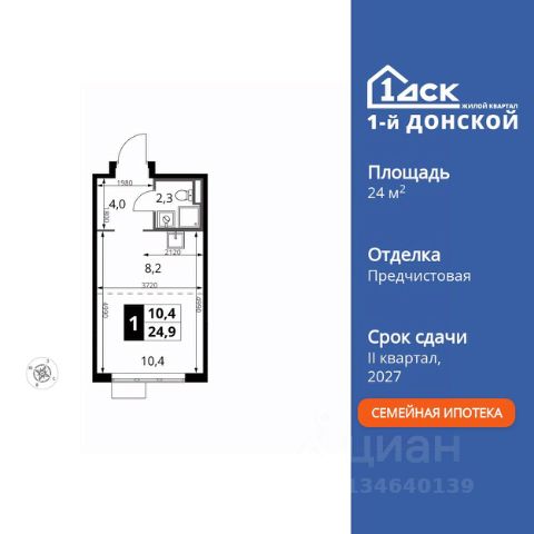Прямая продажа от застройщика! Жилой Комплекс класса Комфорт Плюс. Продаётся квартира-студия номер 687 общей площадью 24.4 кв.м. на 24-м этаже 24 этажного здания. Предчистовая отделка. Цена с учётом скидки. Особенности квартиры: - МЦД-5 в пешей доступности - Квартал с собственной набережной - Свои 2 детских сада и школа - Организуем показ в удобное для вас время! - Линейная планировка - максимальная функциональность и удобство. - Увеличенная высота потолков - ощущение простора и легкости. - Ниша под шкаф - компактное и удобное место для вещей. Квартира с предчистовой отделкой. Вам не придется заниматься черновыми и трудоёмкими работы, а чистовую отделку и дизайн - сделайте на свой вкус. Информация о комплексе: ЖК "1-й Донской" в 7 км от МКАД: гармония городского комфорта и природы. Квартиры на 2-3 стороны света, форма секций и разная этажность создают динамичную архитектуру. Тёплая палитра фасадов и подсветка подчеркивают образ. Рядом - Ермолинский парк, Видновский лесопарк и Жуковский парк. Природа воздействует на все уровни восприятия: от видов до звуков и ароматов. Идеальный баланс для жизни в гармонии с окружающей средой. Транспортная доступность: Комплекс удобно расположен в 7 км от МКАД по трассе М-4 Дон (через Видное). Расстояние до Каширского шоссе составляет 12 км. Добраться до метро и центра Москвы позволяет развитая сеть маршрутов общественного наземного транспорта. Действующая ж/д станция Калинина Павелецкого направления в 15-17 минутах ходьбы (МЦД-5 в 2025-2026 гг). Внутренняя инфраструктура: "1-й Донской": продуманная среда в развивающемся районе. На территории - муниципальные школа и 2 детских сада, поликлиника, торговый центр с площадью для мероприятий. Сеть пешеходных маршрутов ведёт к магазинам и кафе, отделённым от дорог зелёными фито-стенами. Сквозные подъезды с панорамным остеклением и входами с улицы и двора наполнены светом. Всё для комфортной жизни в шаговой доступности, от повседневных нужд до общественных пространств. Квартира с предчистовой отделкой - ваш дизайн без черновых работ